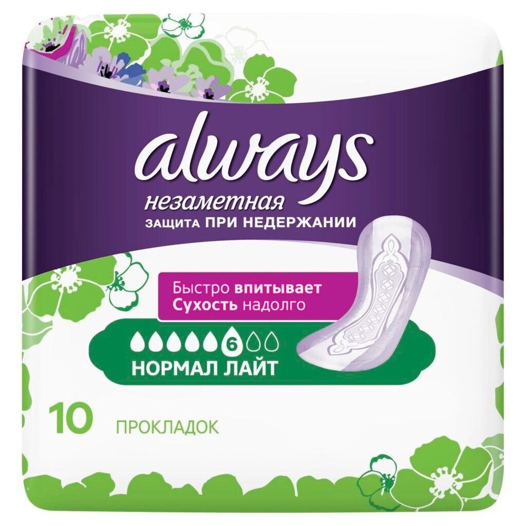 Прокладки Always «Незаметная защита при недержании» Нормал Лайт, 10 шт. Для тех моментов, когда вам необходима дополнительная защита, есть прокладки Always «Незаметная защита при недержании». Они впитывают в 3 раза больше жидкости, чем обычные ежедневные прокладки*, и надолго сохраняют сухость. Кроме того, они оснащены технологией нейтрализации запаха, которая дарит непревзойденную свежесть и обеспечивает чувство уверенности.