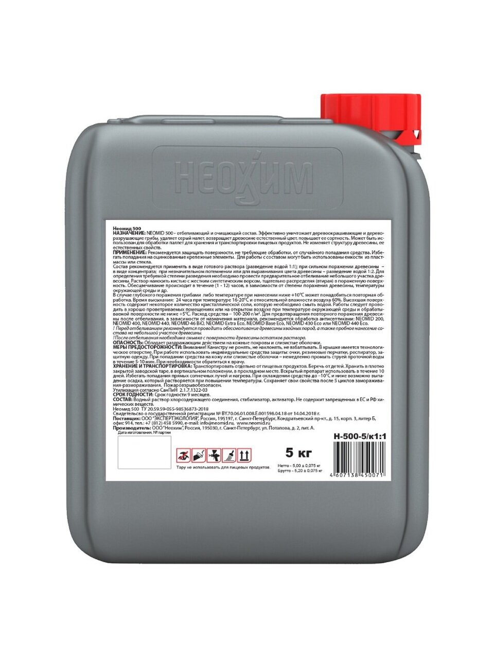 NEOMID 500 — отбеливающий и очищающий состав. Эффективно уничтожает деревоокрашивающие и дереворазрушающие грибы, удаляет серый налет, возвращает древесине естественный цвет, повышает ее сортность. Может быть использован для обработки паллет для хранения и транспортировки пищевых продуктов. Не изменяет структуру древесины, ее естественных свойств.