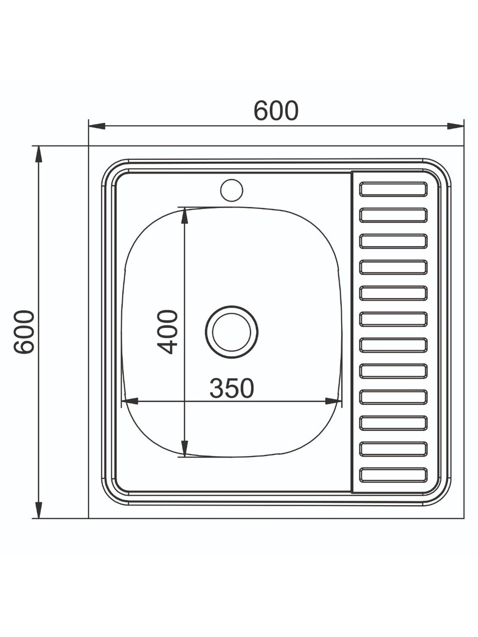 Размер мойки — 600х600 мм, материал — нержавеющая сталь толщиной 0.4 мм, форма квадратная, одна чаша, серебристый цвет.
