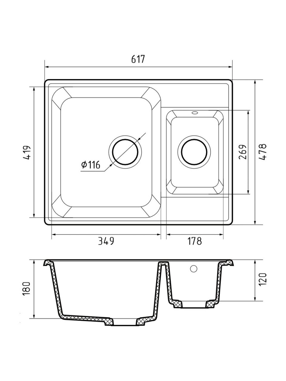- Размер чаши: 350x420x180 мм, 178x269x120 мм.