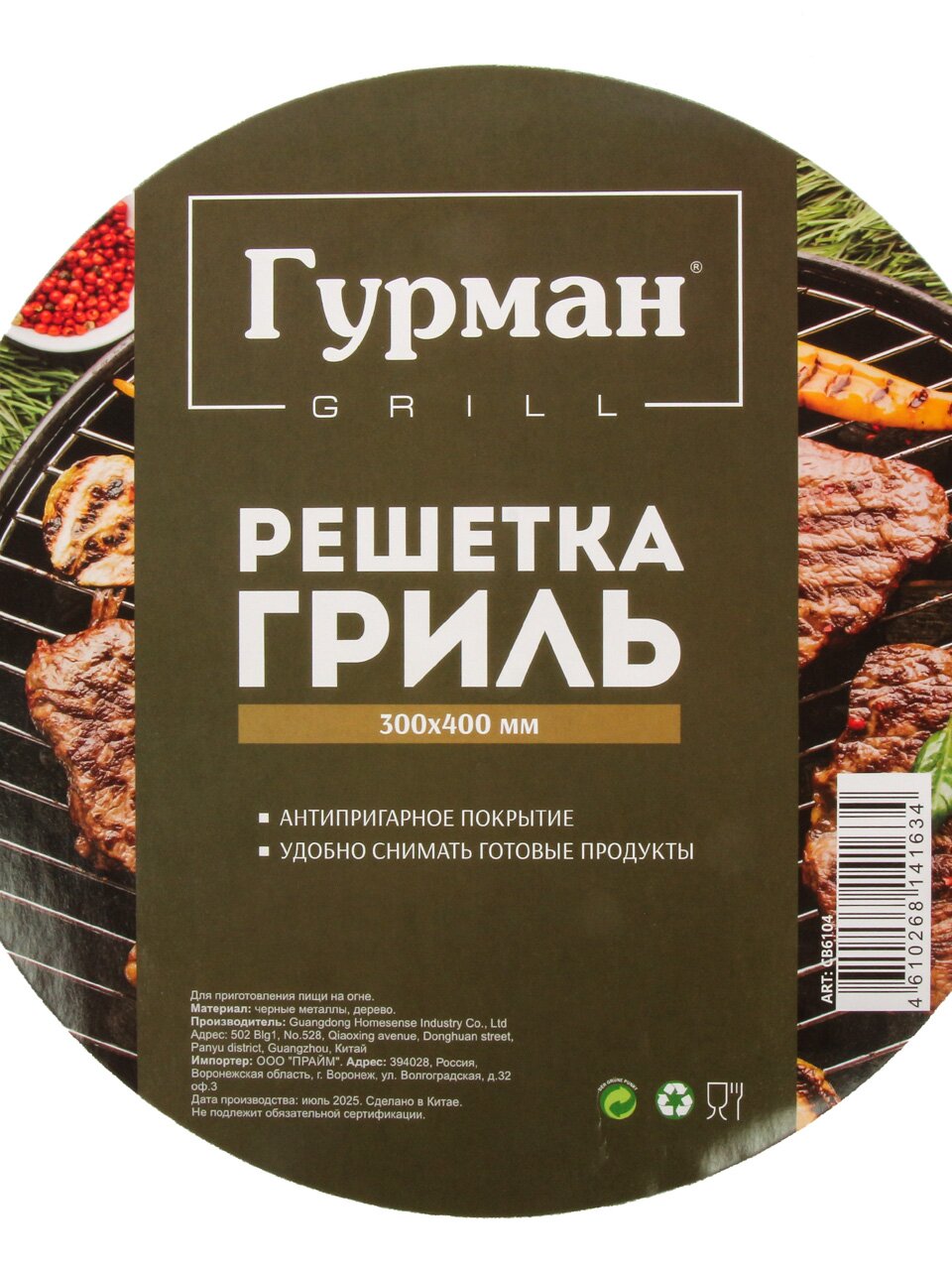 Решетка барбекю 300х400 мм Гурман: удобно жарить мясо и овощи на даче, антипригарное покрытие, деревянная ручка для безопасности.
