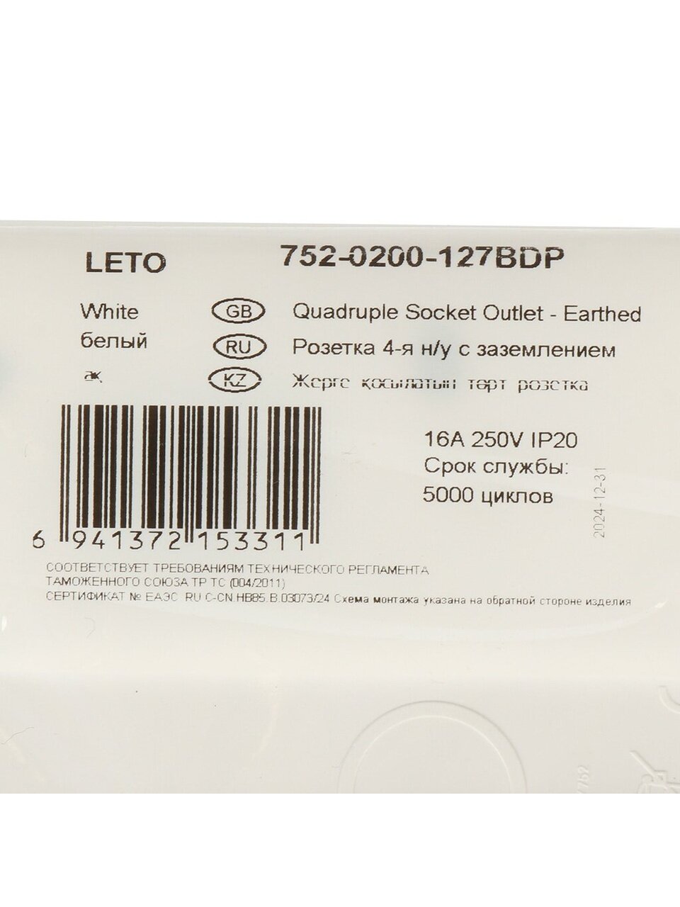 Вы можете приобрести «Розетка открытой установки, 4 гнезда, с заземлением, 16 А, 220 В, пластик, IP20, белая, закрытый корпус, Lezard, Leto, 752-0200-127BDP» и другие товары в нашем интернет-магазине в Смоленске по низким ценам и с бесплатным самовывозом.