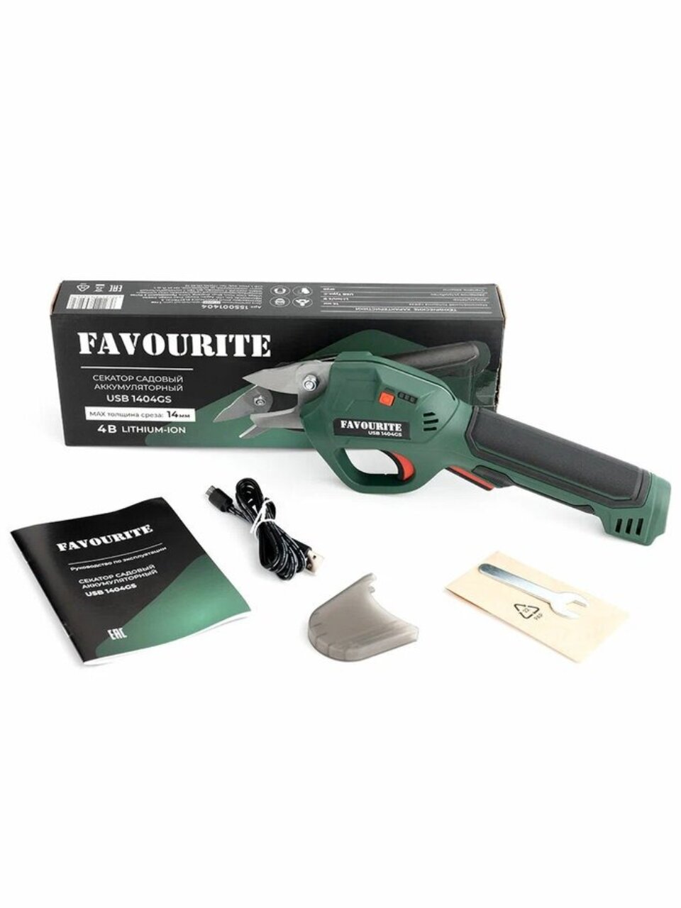Оформите заказ на аккумуляторный секатор Favourite USB 1404GS — получите быструю доставку, гарантию и уверенность в качестве инструмента для вашего сада.
