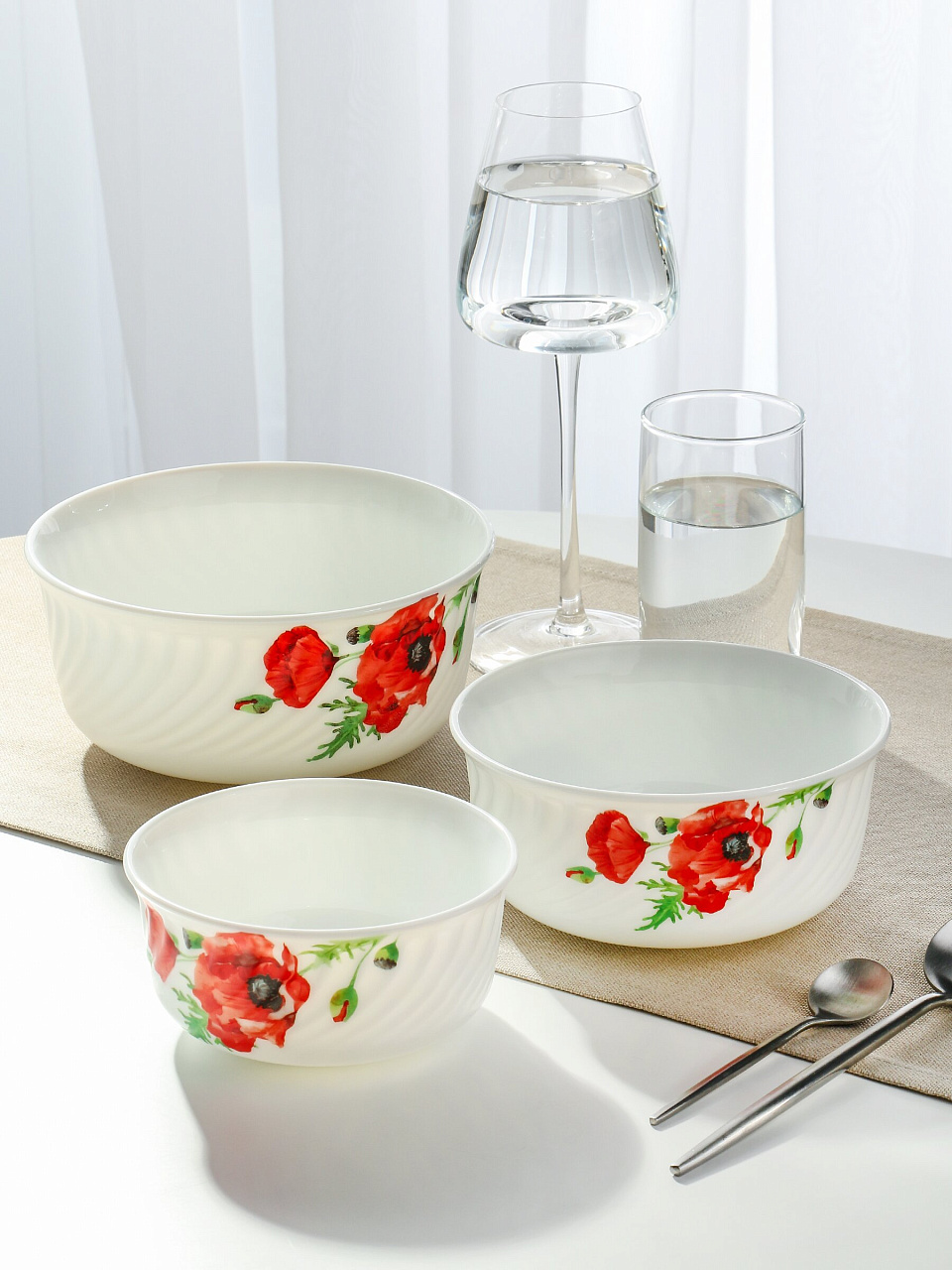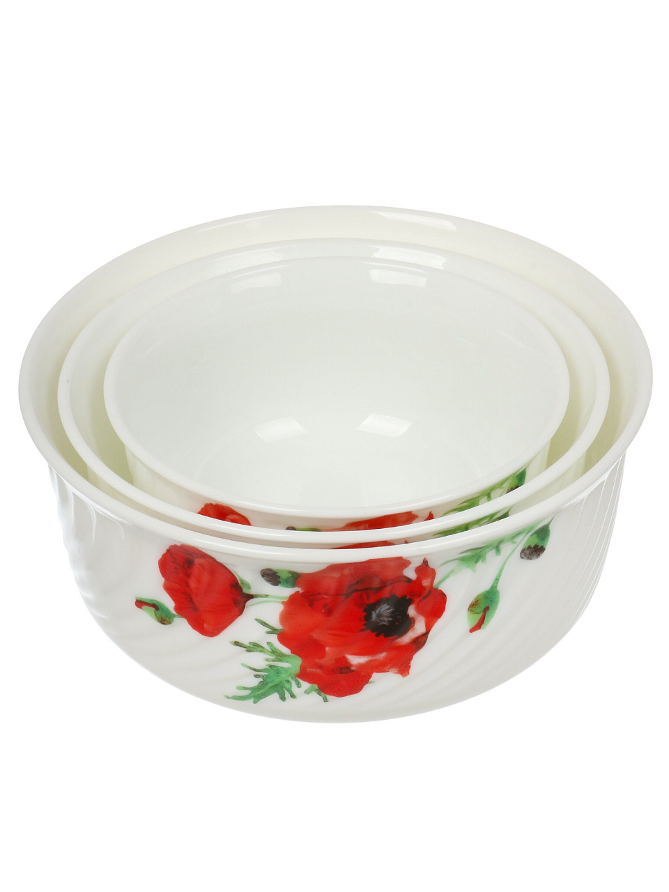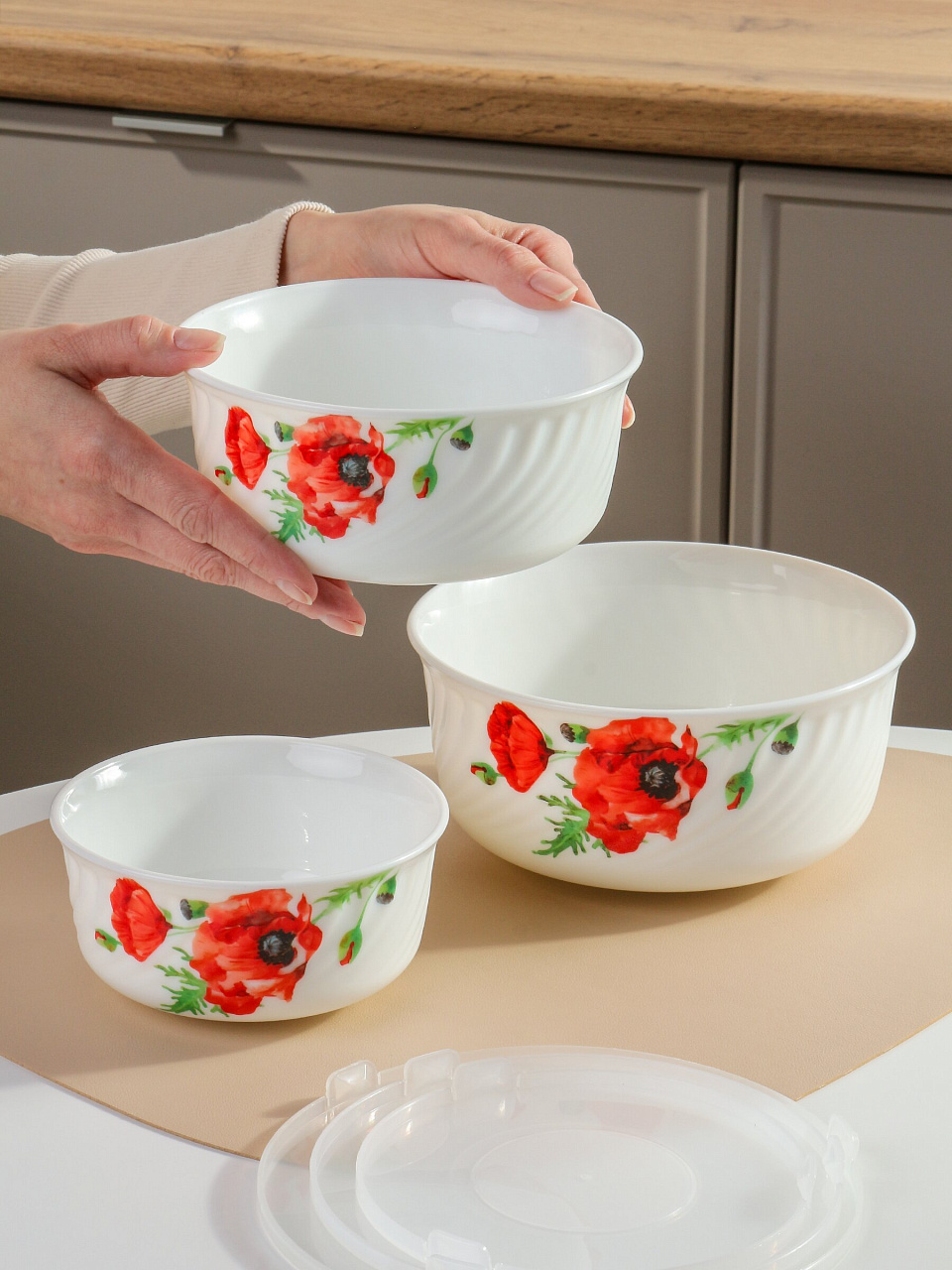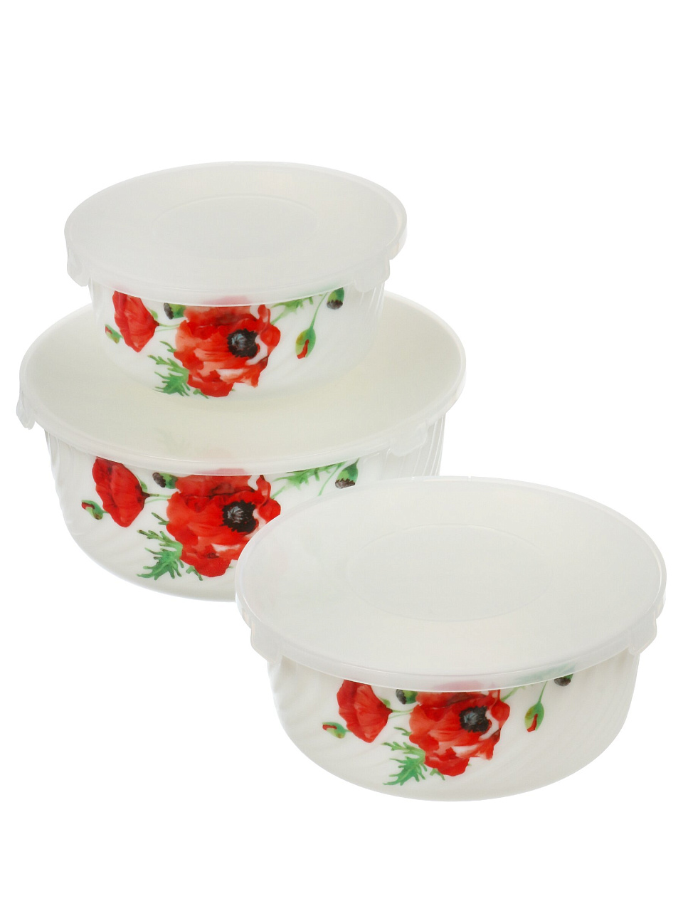 Салатники Daniks Алый мак: 3 стеклокерамических миски с крышками для сервировки и хранения — оптимальный набор для кухни, дачи и подарка.