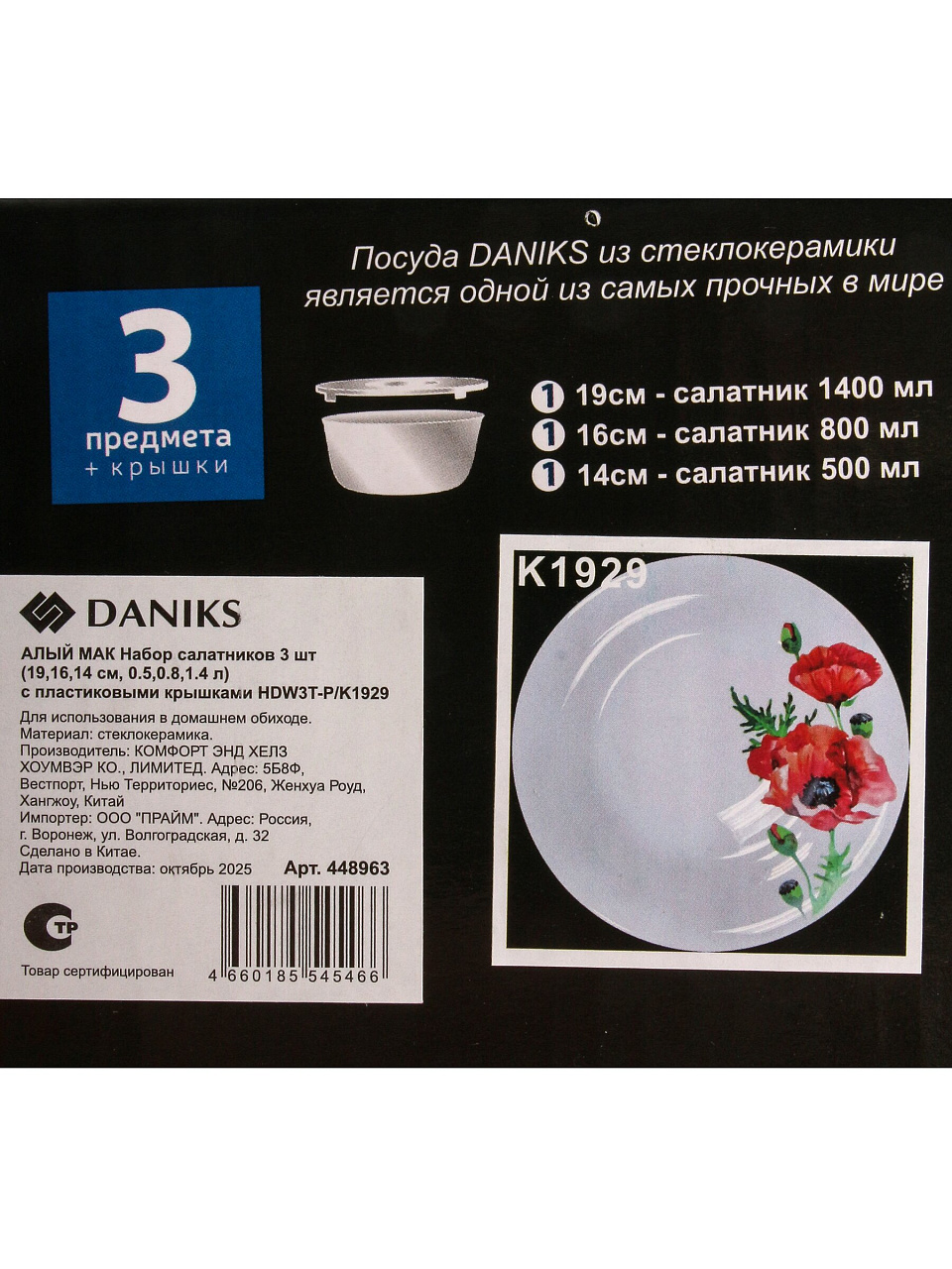 В наборе три круглых салатника: диаметры 14, 16 и 19 см, высота 9 см, объёмы 0.5, 0.8 и 1.4 л. Все миски выполнены из прочной стеклокерамики с рисунком, крышки входят в комплект.