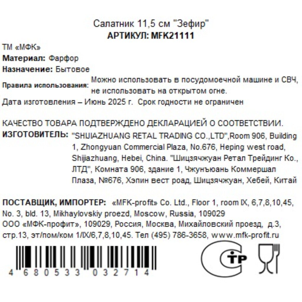 Вы можете приобрести «Салатник фарфор, круглый, 11.5х6 см, 0.3 л, Зефир, МФК, MFK21111» и другие товары в нашем интернет-магазине в Клинцах по низким ценам и с бесплатным самовывозом.