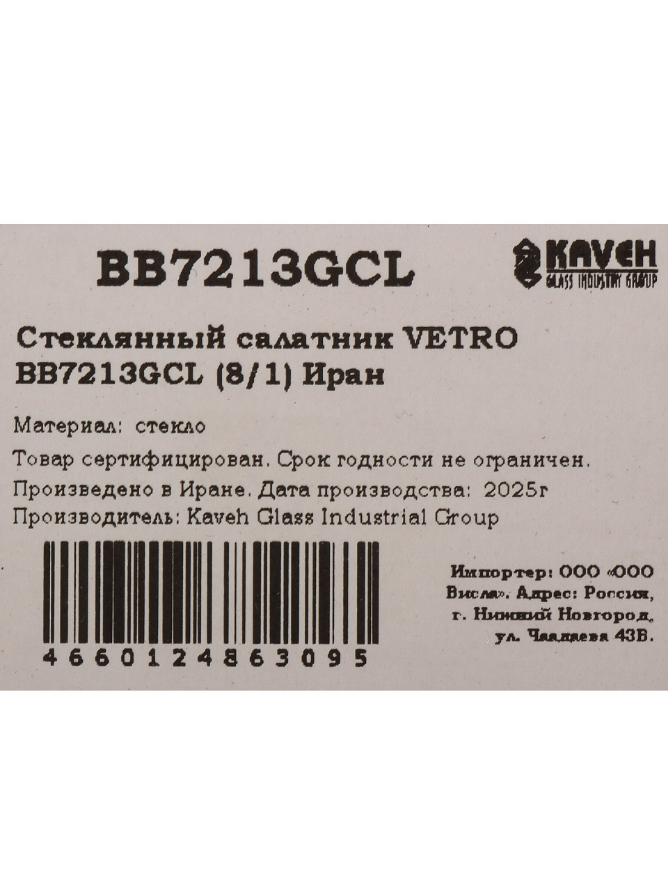 Салатник стекло, овальный, 20 см, подарочная упаковка, Vetro, 120783, прозрачная