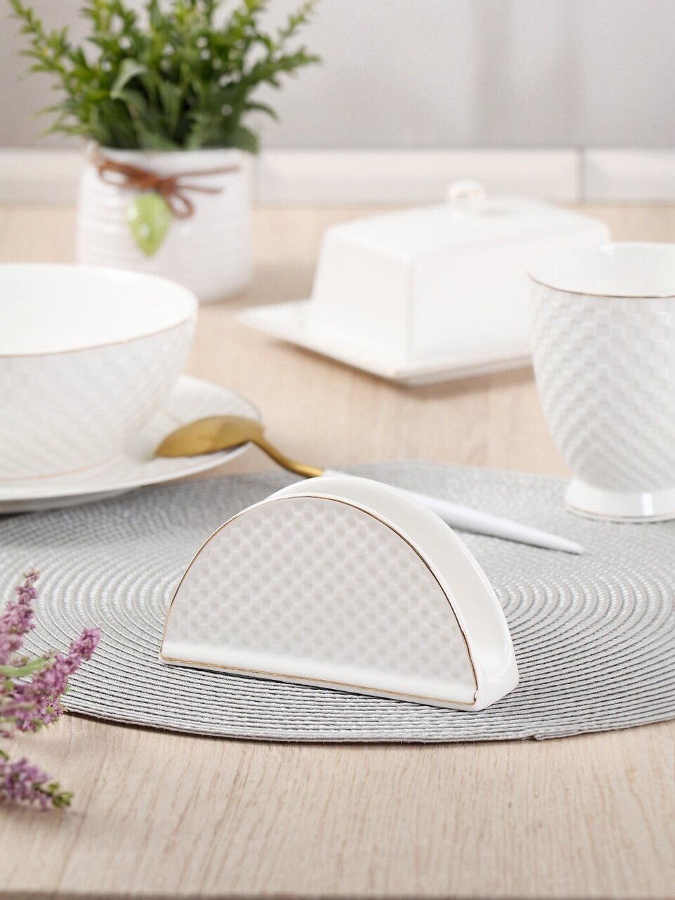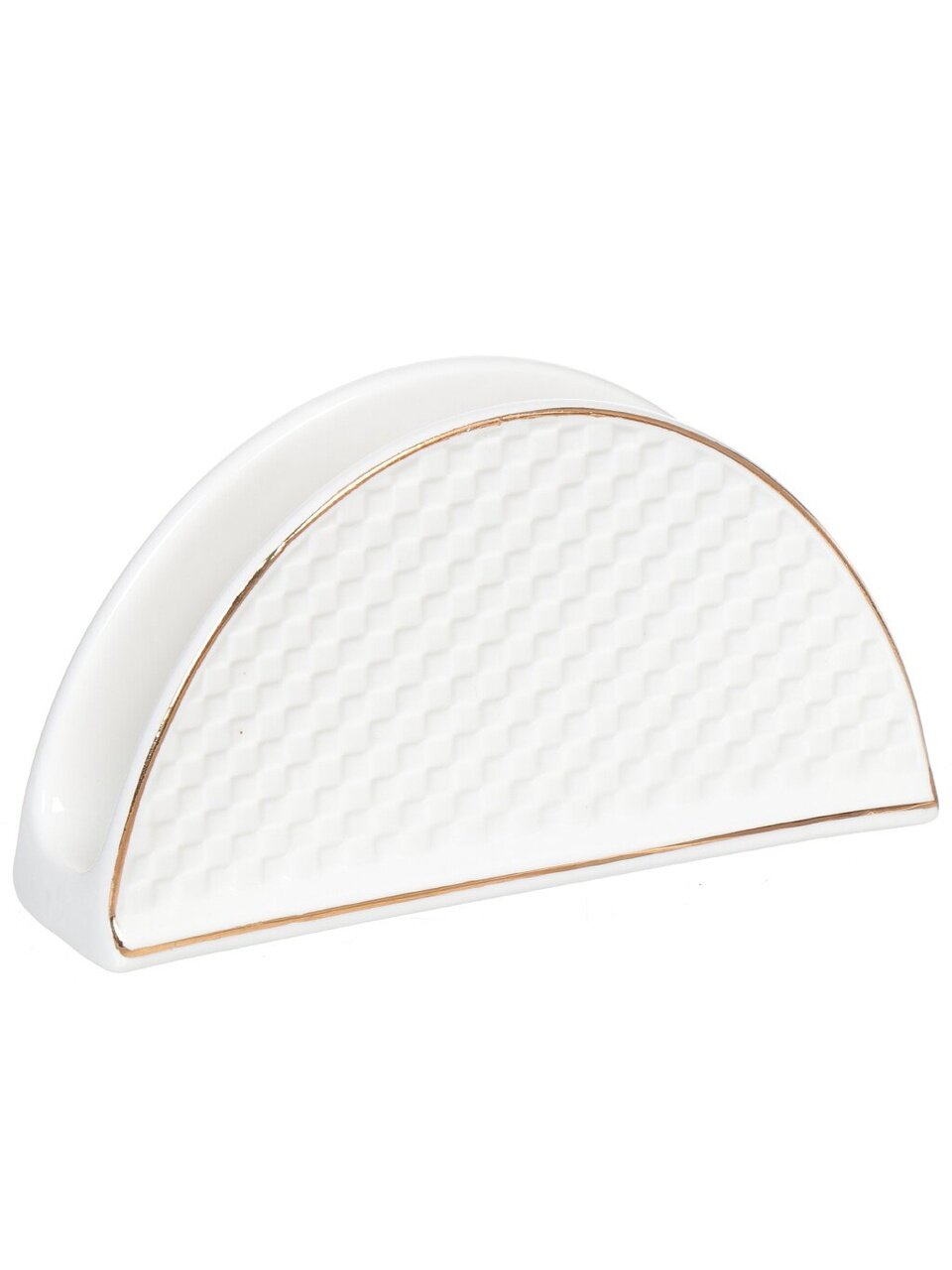 Подставка для салфеток изготовлена из керамики высокого качества. Сдержанный дизайн, нейтральный белый цвет, обтекаемая форма, текстура – то, что необходимо для сервировки в классическом стиле. Подставка легко отмывается губкой.