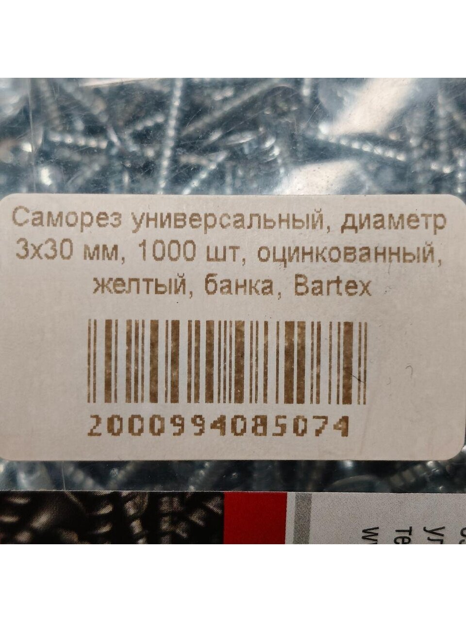 Вы можете приобрести «Саморез универсальный, диаметр 3х30 мм, 1000 шт, оцинкованный, в ассортименте, банка, Bartex» и другие товары в нашем интернет-магазине в Серпухове по низким ценам и с бесплатным самовывозом.