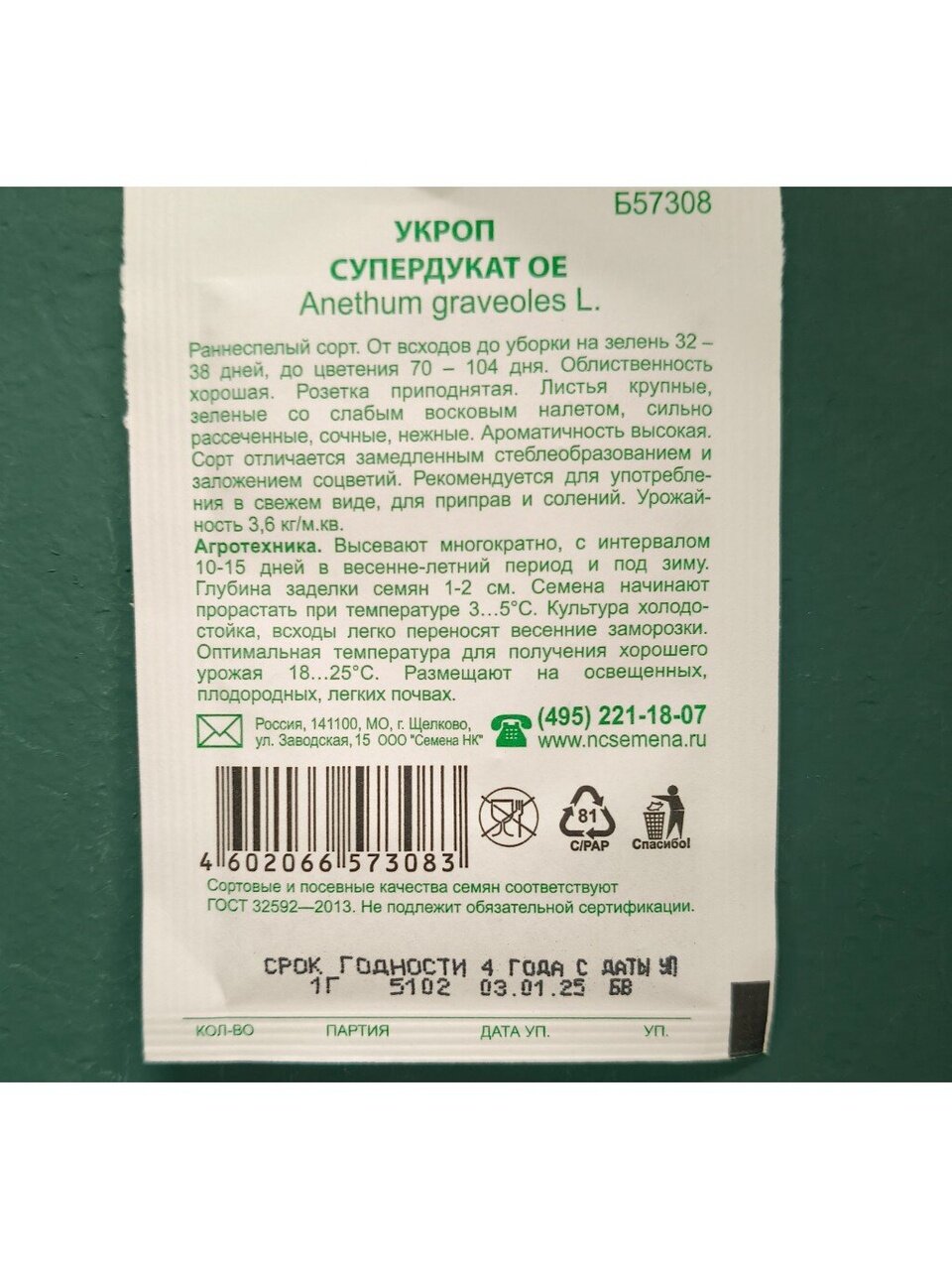 - Упаковка семян: белая упаковка.