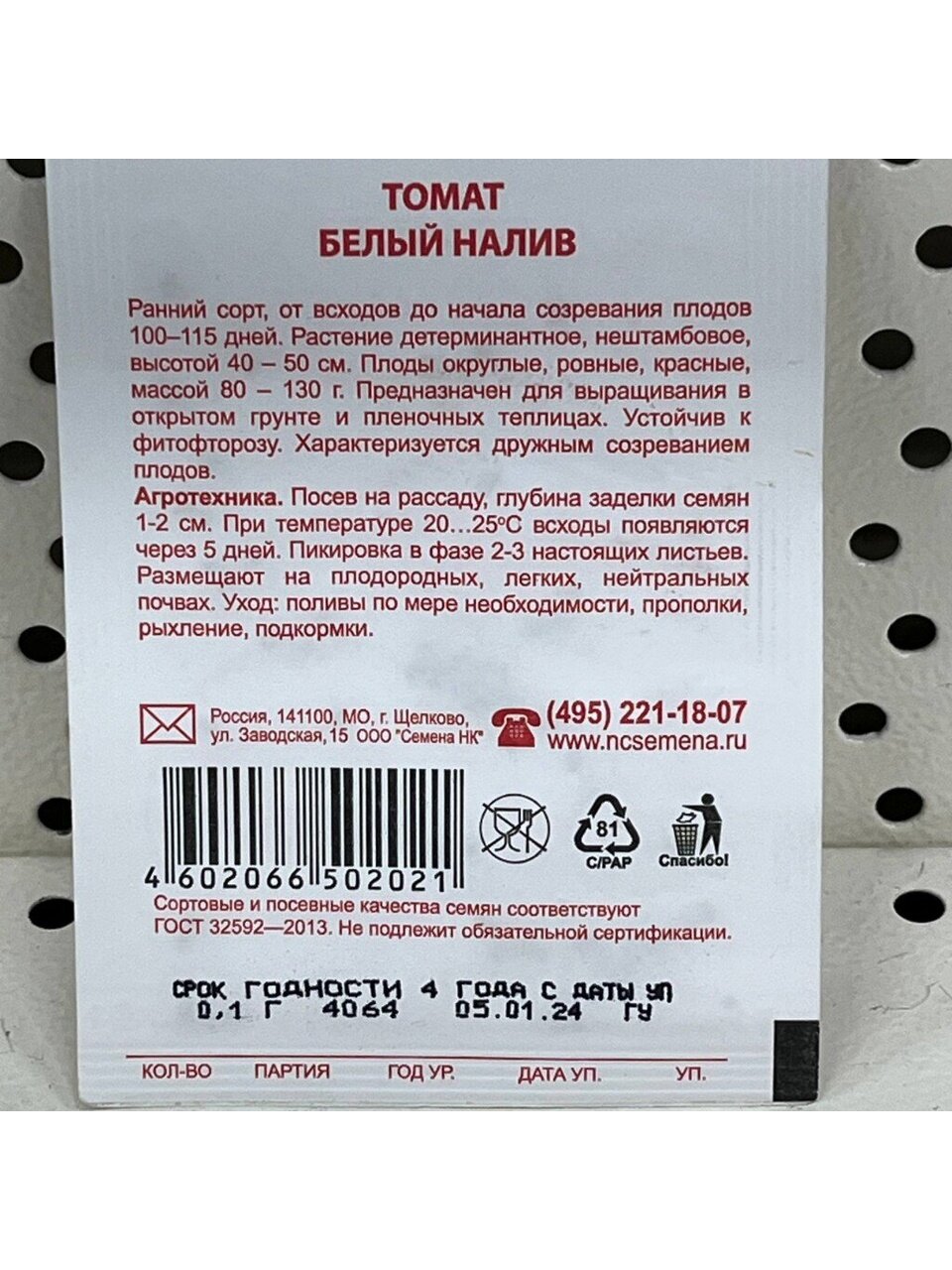 Семена Томат, Белый Налив, 0.1 г, белая упаковка, Русский огород