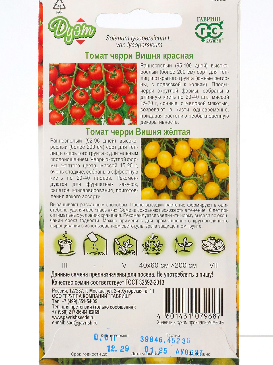 Семена Томат, Вишня желтая, 0.05 г, Дуэт, +Вишня красная 0.05 г, цветная упаковка, Гавриш