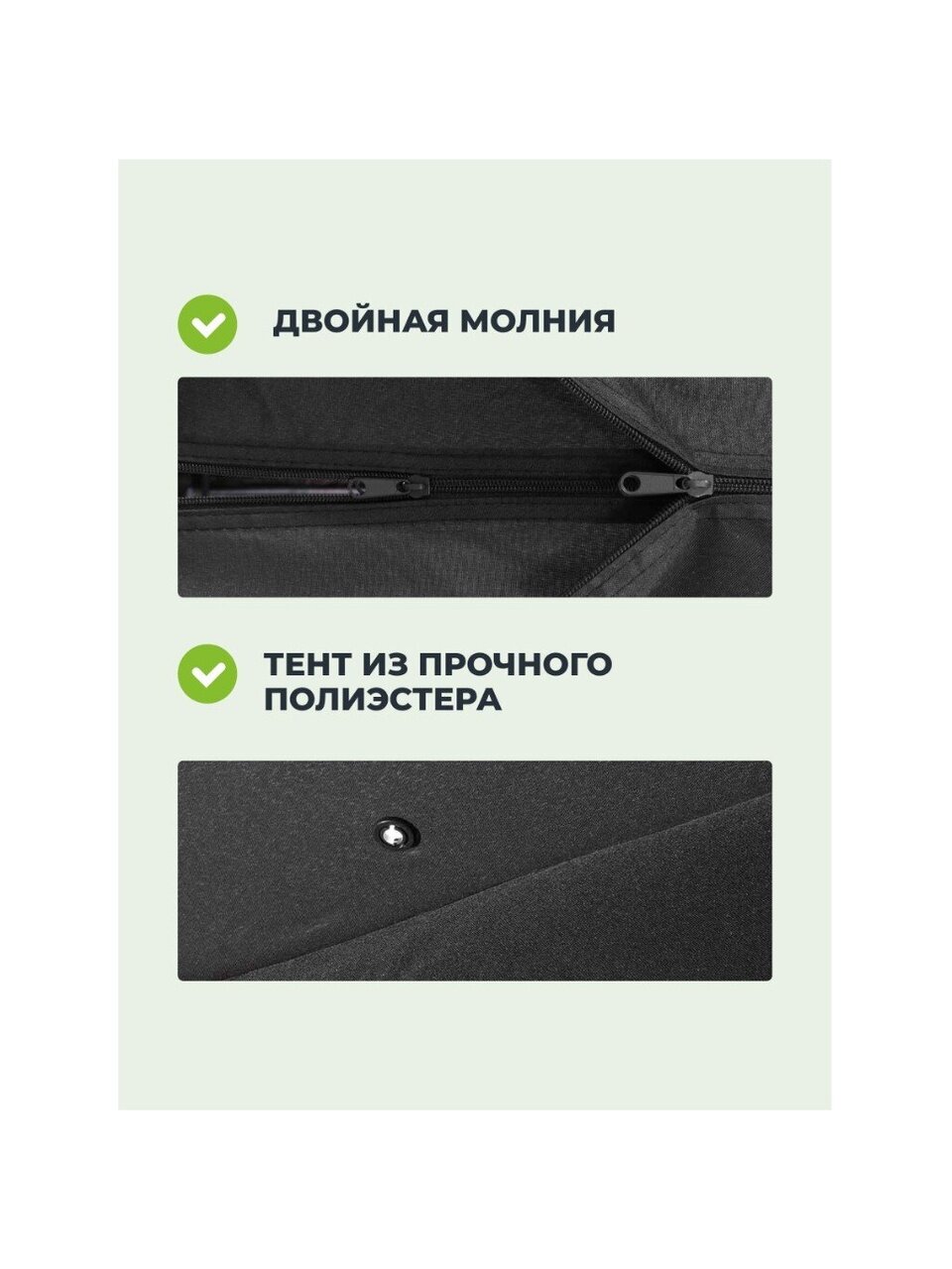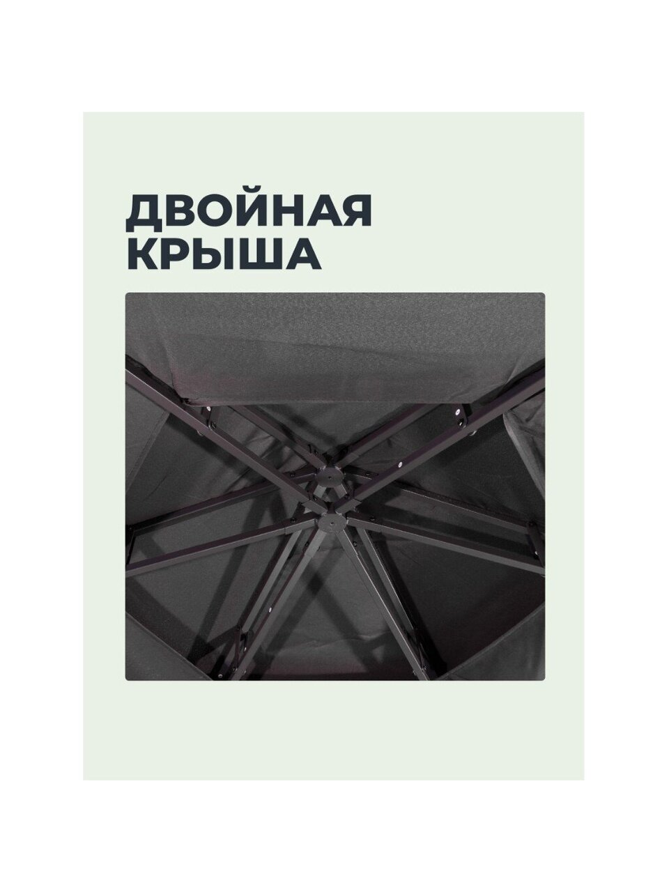 - Материал тента — крыша: полиэстер 160 г/м², боковые стенки: полиэстер 140 г/м² с сеткой.