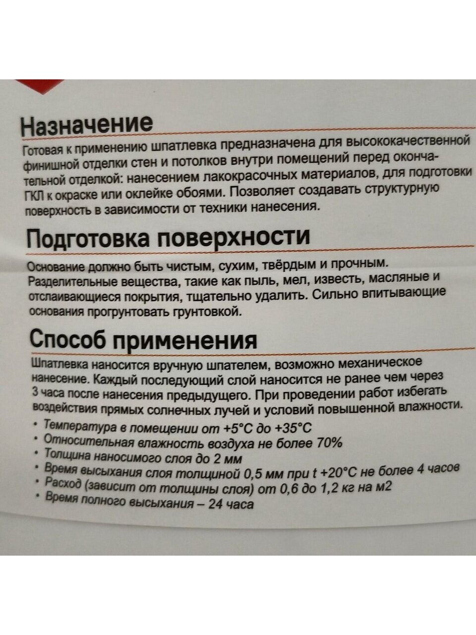 Готовая к применению финишная шпаклевка используется для создания заключительного слоя перед нанесением ЛКМ. Имеет в своем составе тонкодисперсный наполнитель, благодаря которому получается очень ровный слой. Хорошо шлифуется. Благодаря данным свойствам, отлично подходит для подготовки поверхностей к покраске, поклейке обоев.