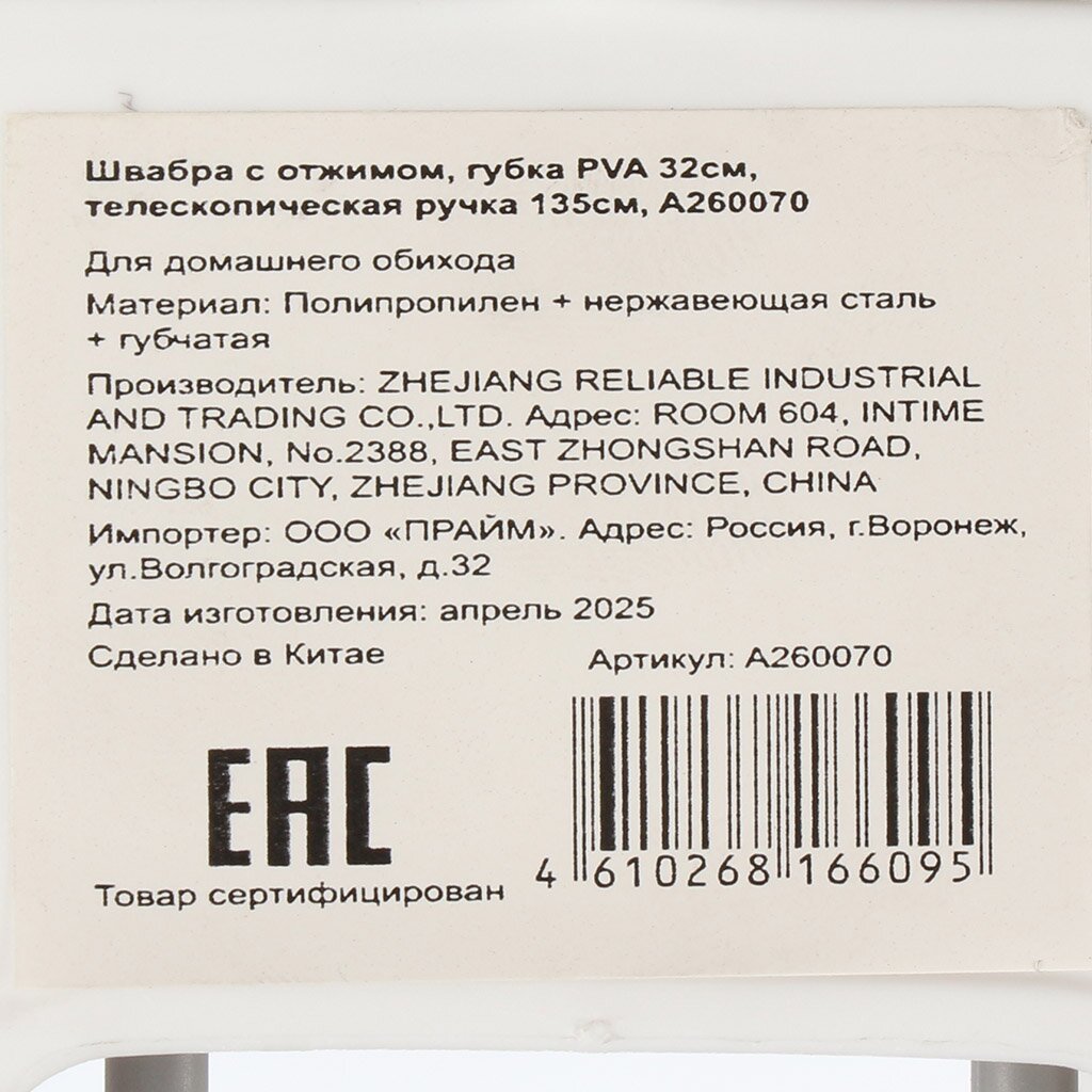 Швабра с отжимом, губка PVA 32см, телескопическая ручка 135см, A260070