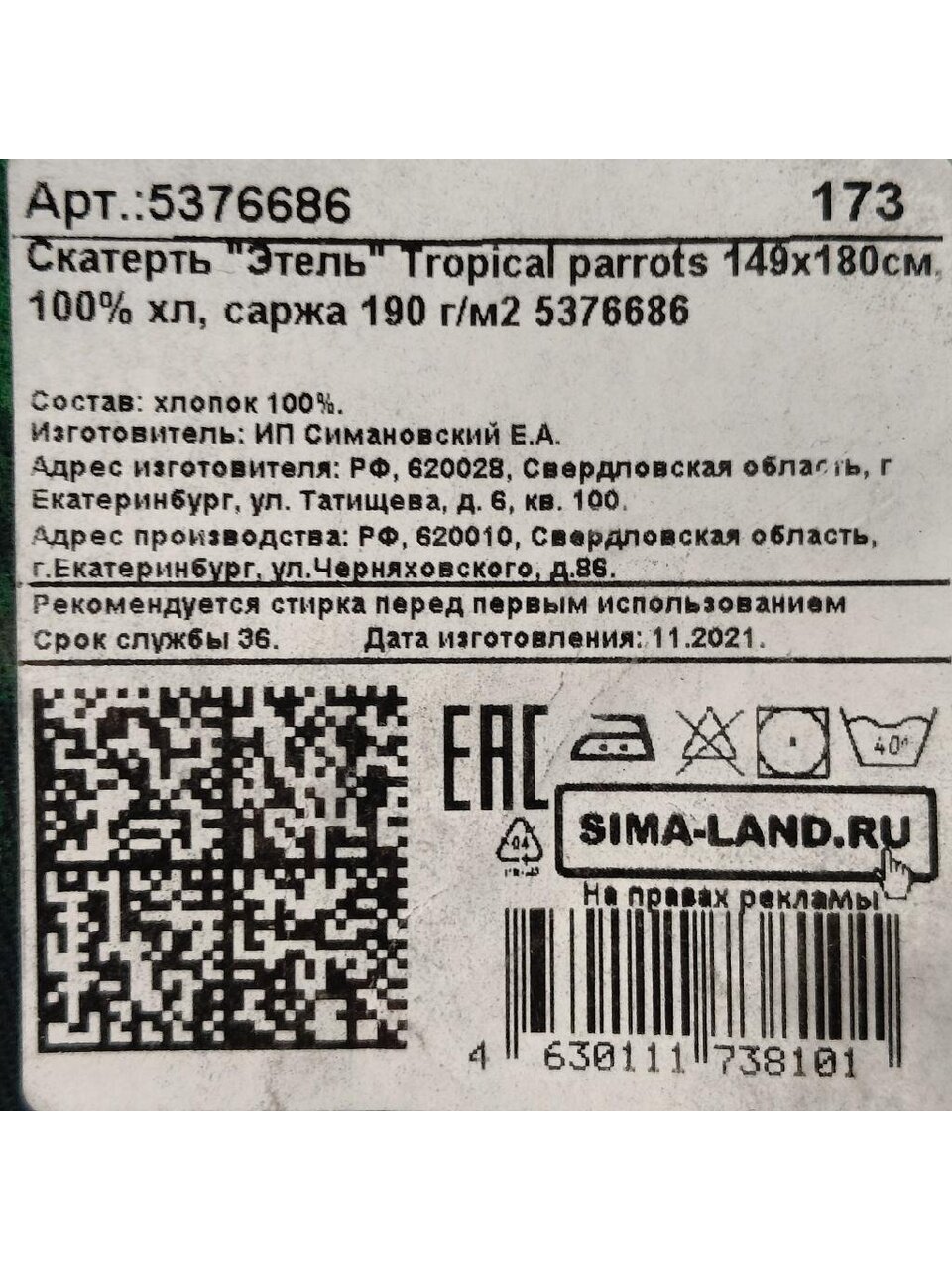 Вы можете приобрести «Скатерть 149х180 см, 100% хлопок, саржа, Этель, Tropical parrots, 5376686» и другие товары в нашем интернет-магазине в Астрахани по низким ценам и с бесплатным самовывозом.