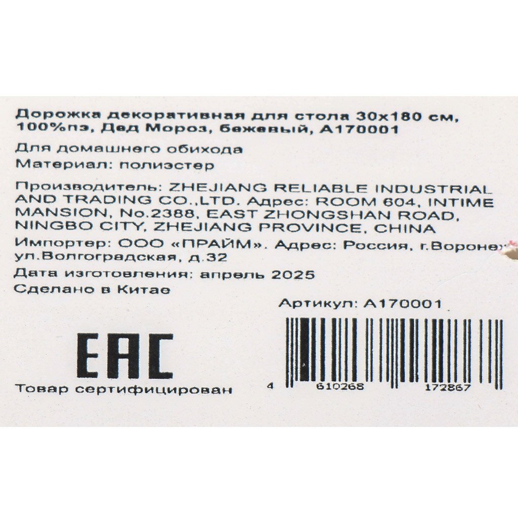 Вы можете приобрести «Дорожка для стола 30х180 см, 100% полиэстер, Дед Мороз, бежевая, декоративная, A170001» и другие товары в нашем интернет-магазине в Клинцах по низким ценам и с бесплатным самовывозом.