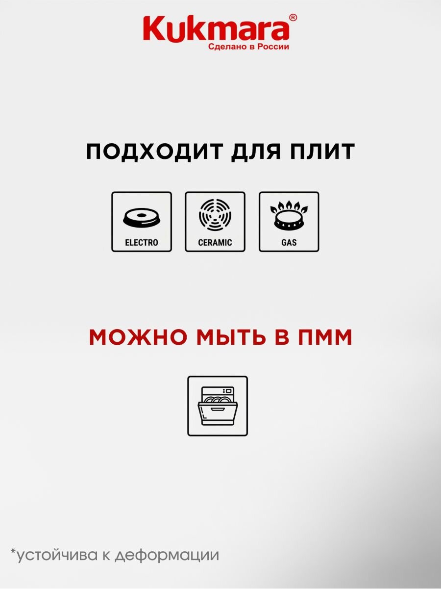 Сковорода совместима с газовыми, электрическими и стеклокерамическими плитами. Для индукционных плит не подходит.