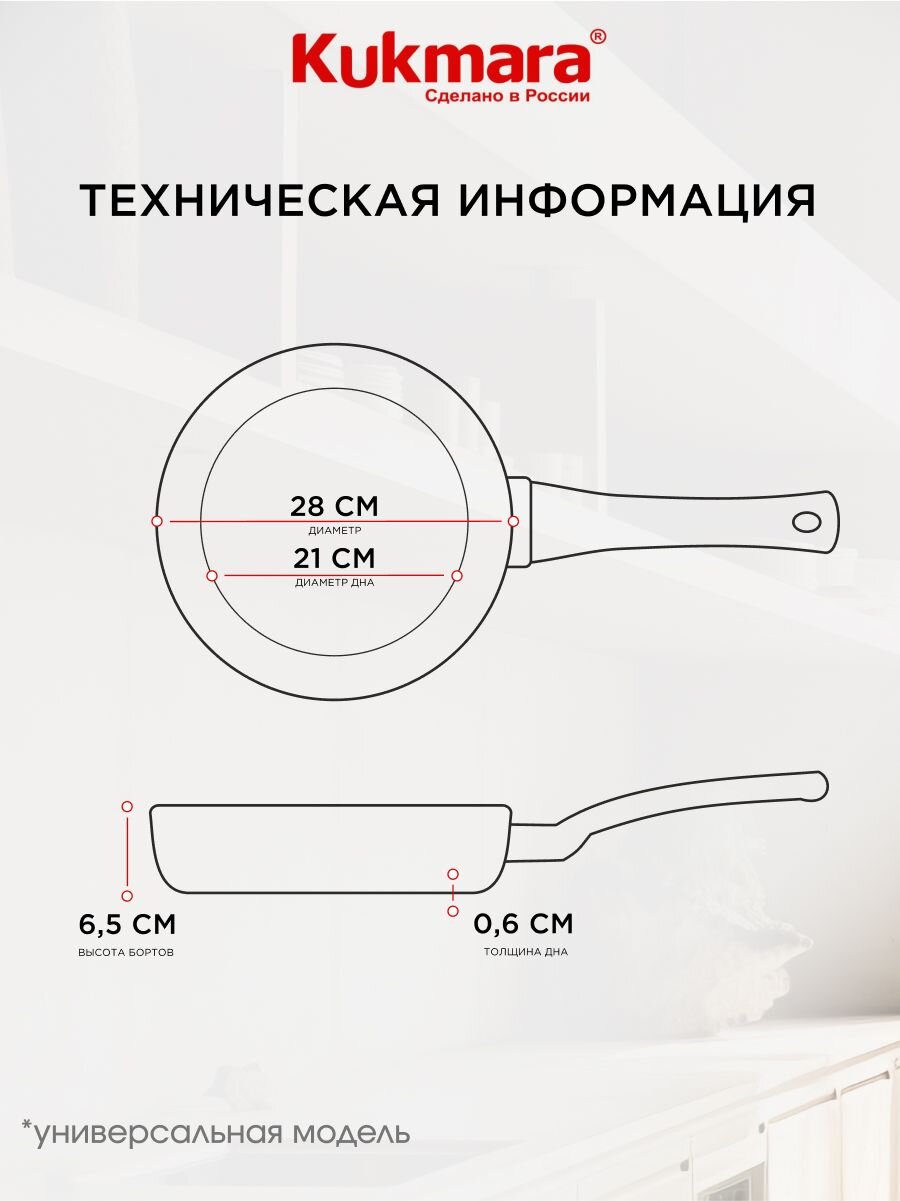 - Универсальный диаметр 28 см — подходит для жарки мяса, рыбы, омлета; идеальный подарок и для дачи, и для городской кухни