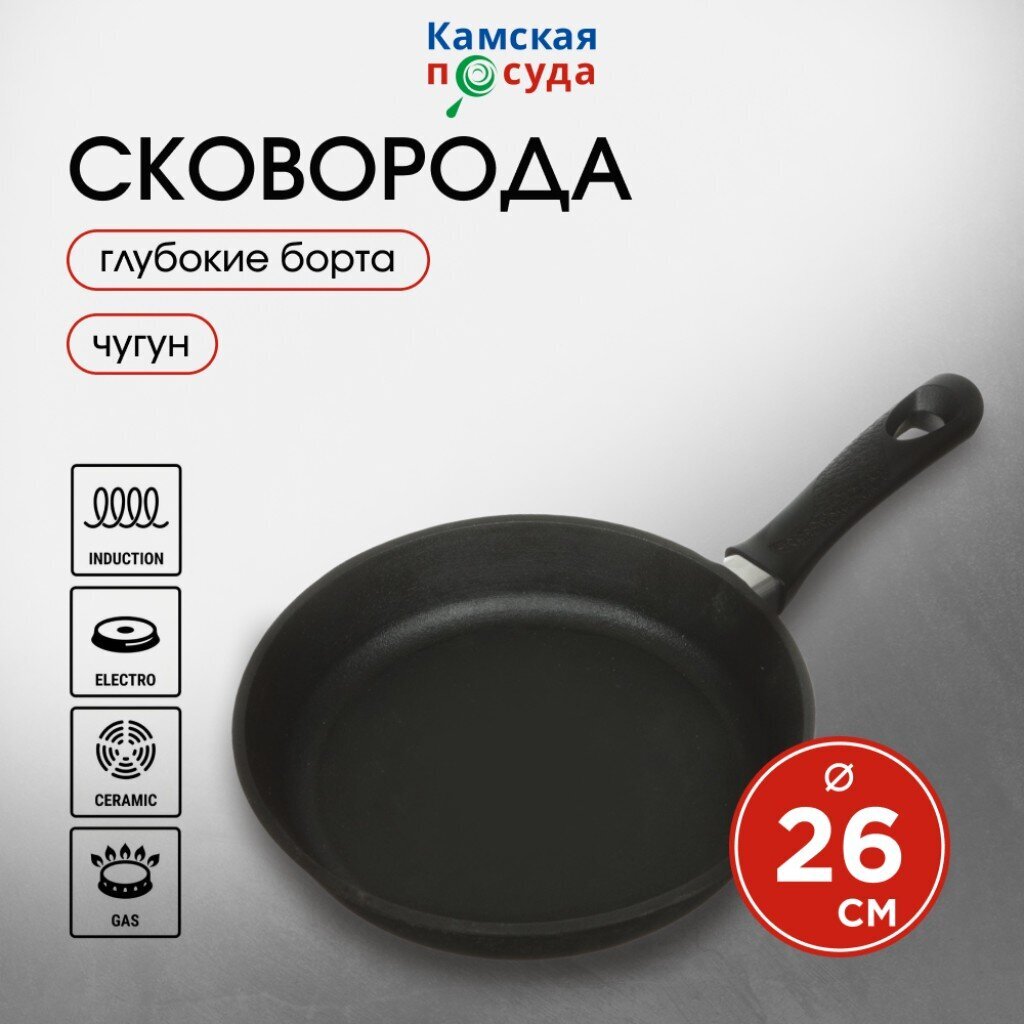Чугунная сковорода 26 см Камская посуда: идеальный выбор для индукции, долгого жарения и здорового питания — без покрытия, для мяса, рыбы и выпечки