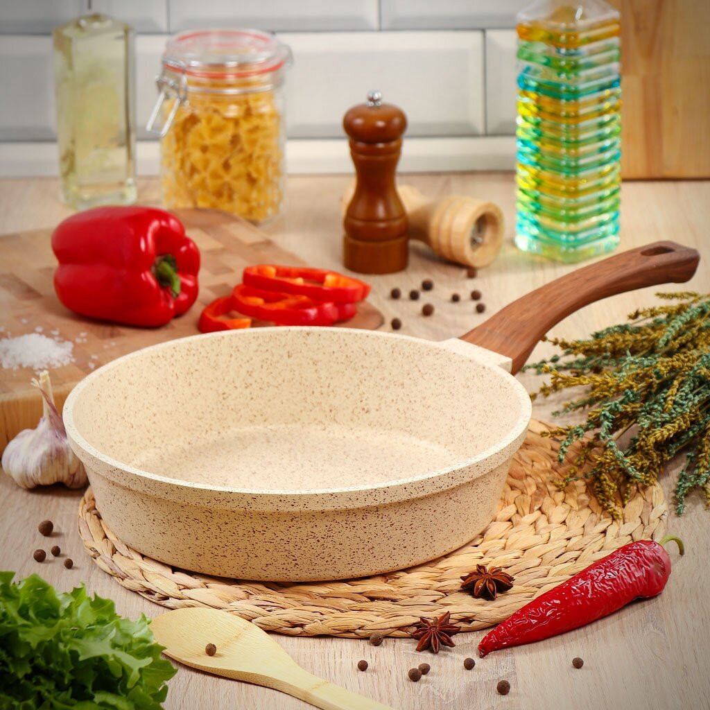 Сковорода из литого алюминия Гурман Estima 28 см — оптимальный выбор для тех, кто ищет прочную посуду с долговечным гранитным антипригарным покрытием. Благодаря утолщённому дну (4 мм) и стенкам (3 мм) тепло распределяется равномерно, что важно для приготовления сочного мяса, хрустящих оладий или нежных омлетов. Часто спрашивают, чем отличается литая сковорода от штампованных аналогов — литой алюминий не деформируется при нагреве, дольше сохраняет тепло и устойчив к царапинам.
