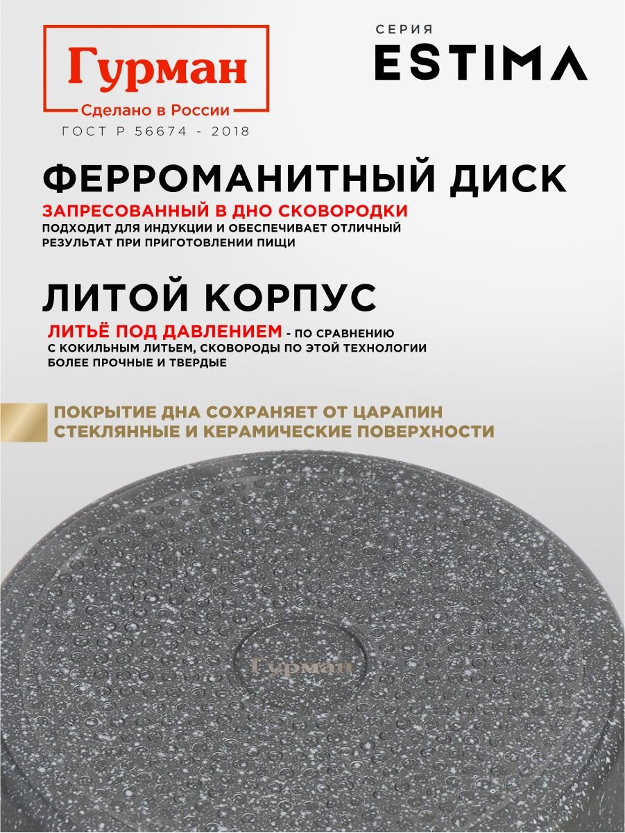 Сковорода из литого алюминия 24 см с гранитным антипригарным покрытием Гурман Estima: жарьте без масла, экономьте время и легко мойте после готовки.