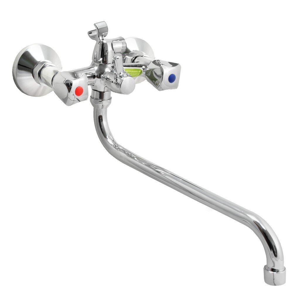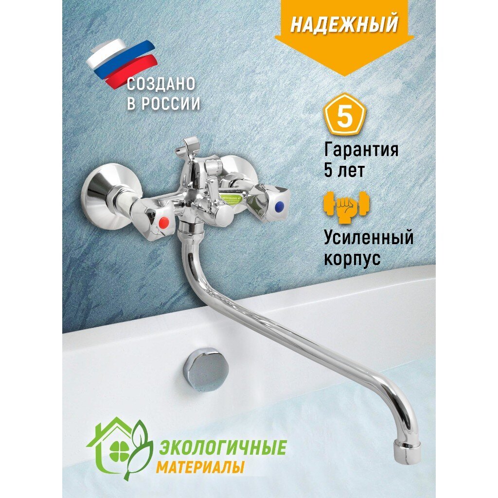 - Длинный поворотный излив 31 см из силумина с глянцевым хромом — удобно для ванн с широкими бортами, устойчив к коррозии, рассчитан на годы службы