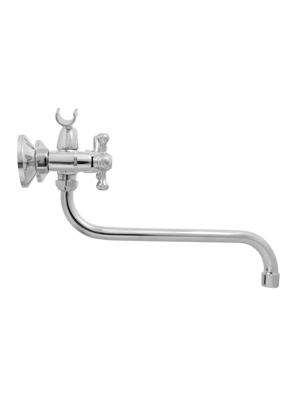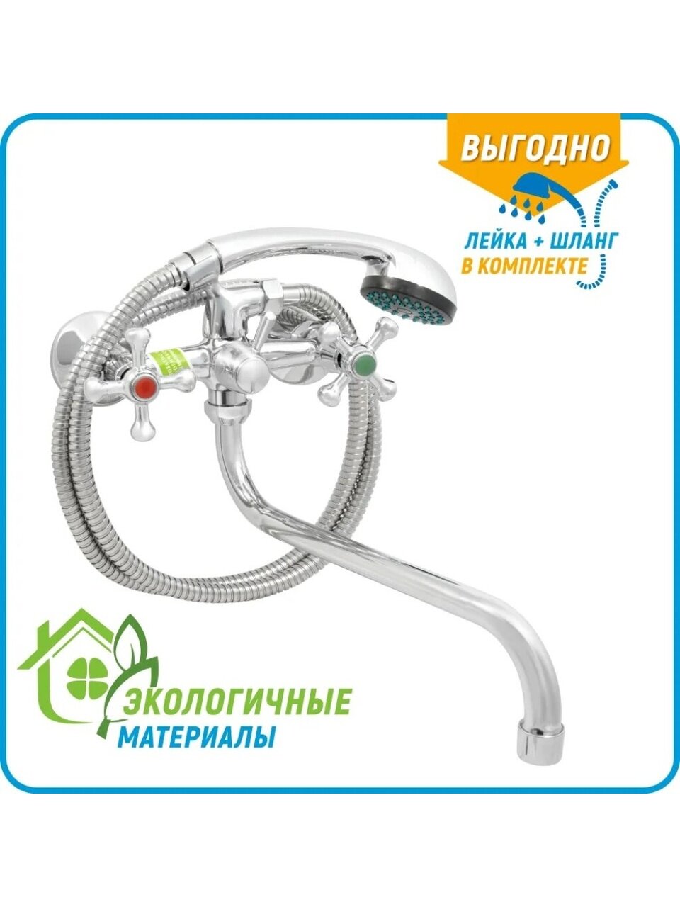 - Корпус из силумина с хромированной глянцевой поверхностью — устойчив к коррозии, сохраняет блеск, длина излива 30 см удобно подходит для стандартных ванн