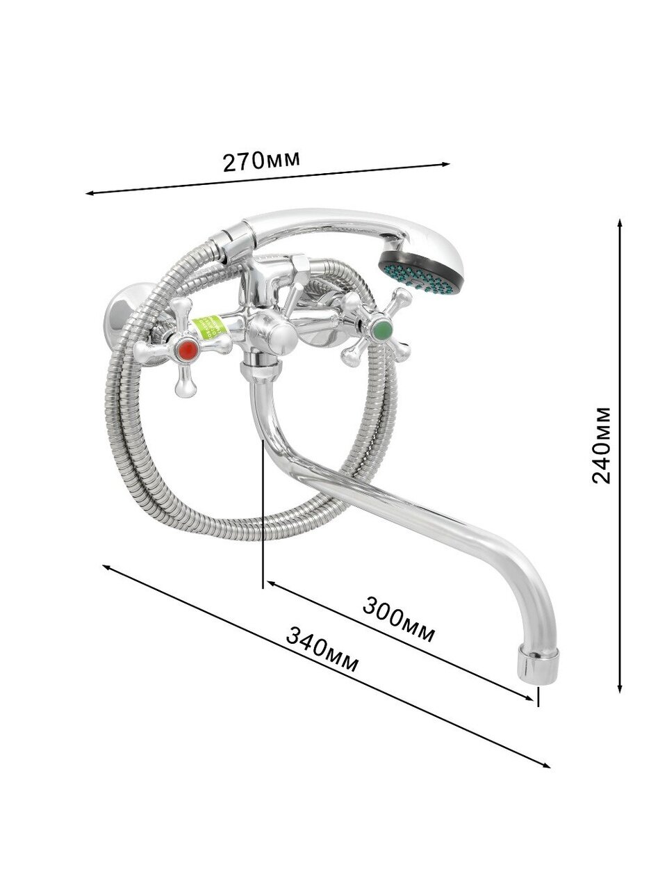 Длина поворотного излива — 30 см, межосевое расстояние — 150 мм, крепление на эксцентрики, стандарт подключения шланга — 1/2". Для монтажа требуется 2 отверстия, установка — вертикальная, настенная.