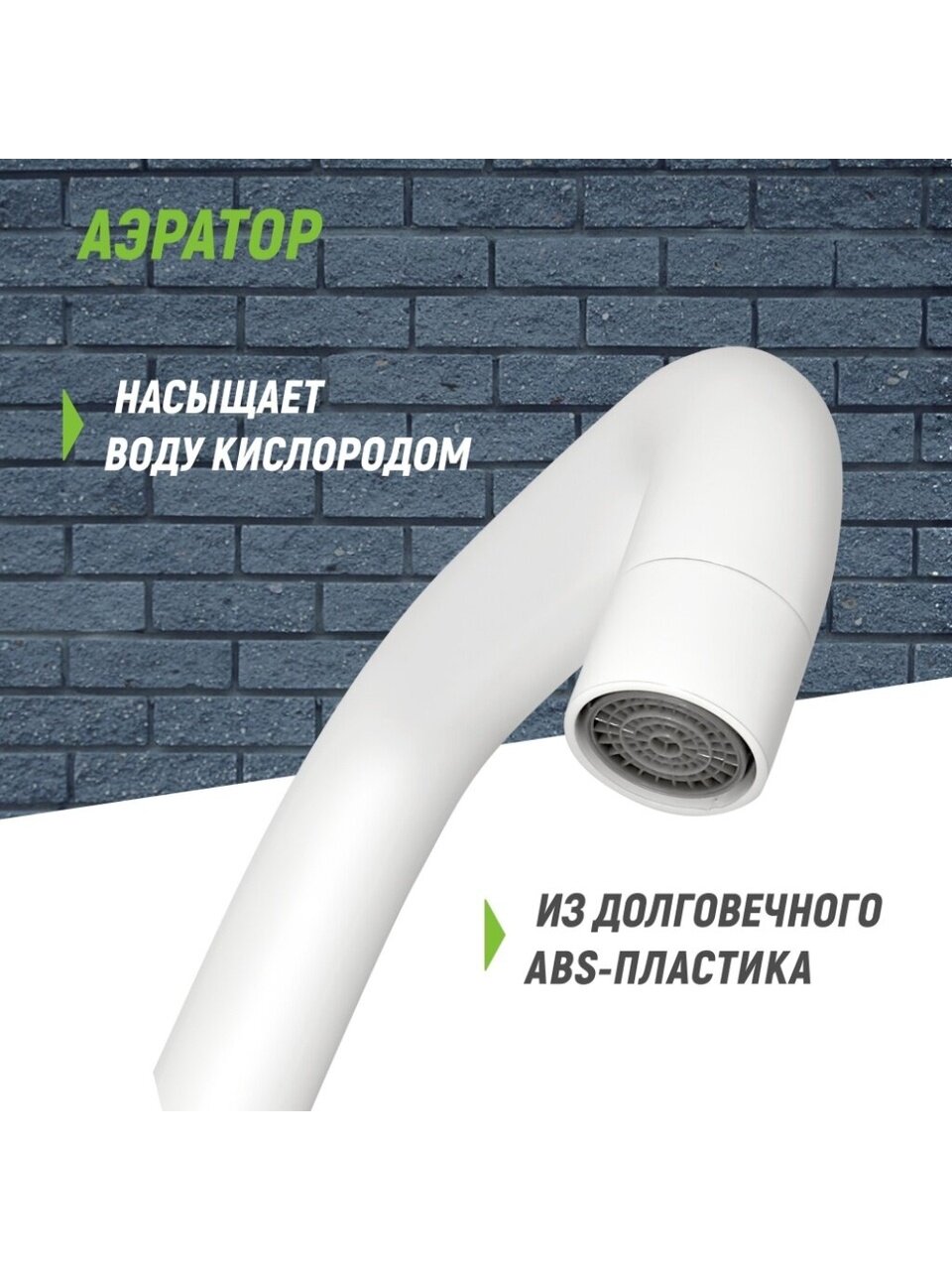 - У излива есть аэратор, который позволяет расходовать воду более экономно и исключает образование брызг.