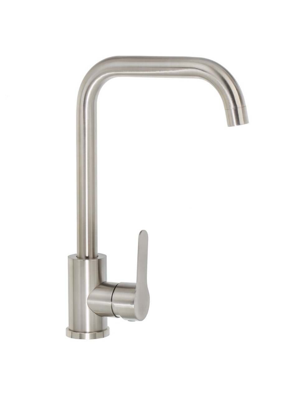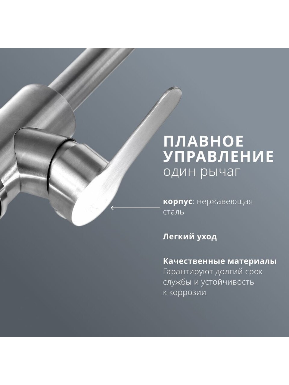 Корпус из нержавеющей стали не подвержен коррозии, выдерживает перепады температуры и механические нагрузки, а сатиновая поверхность устойчива к царапинам и пятнам. Высокий поворотный излив удобен для мытья крупных предметов.