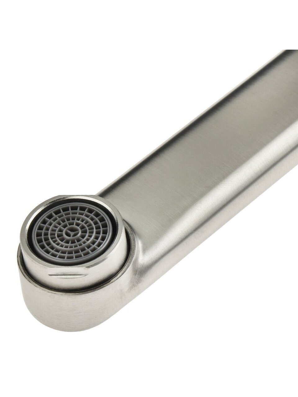 - Параметры и материалы: корпус из нержавеющей стали, длинный поворотный излив 35 см, матовое сатиновое покрытие против отпечатков и царапин