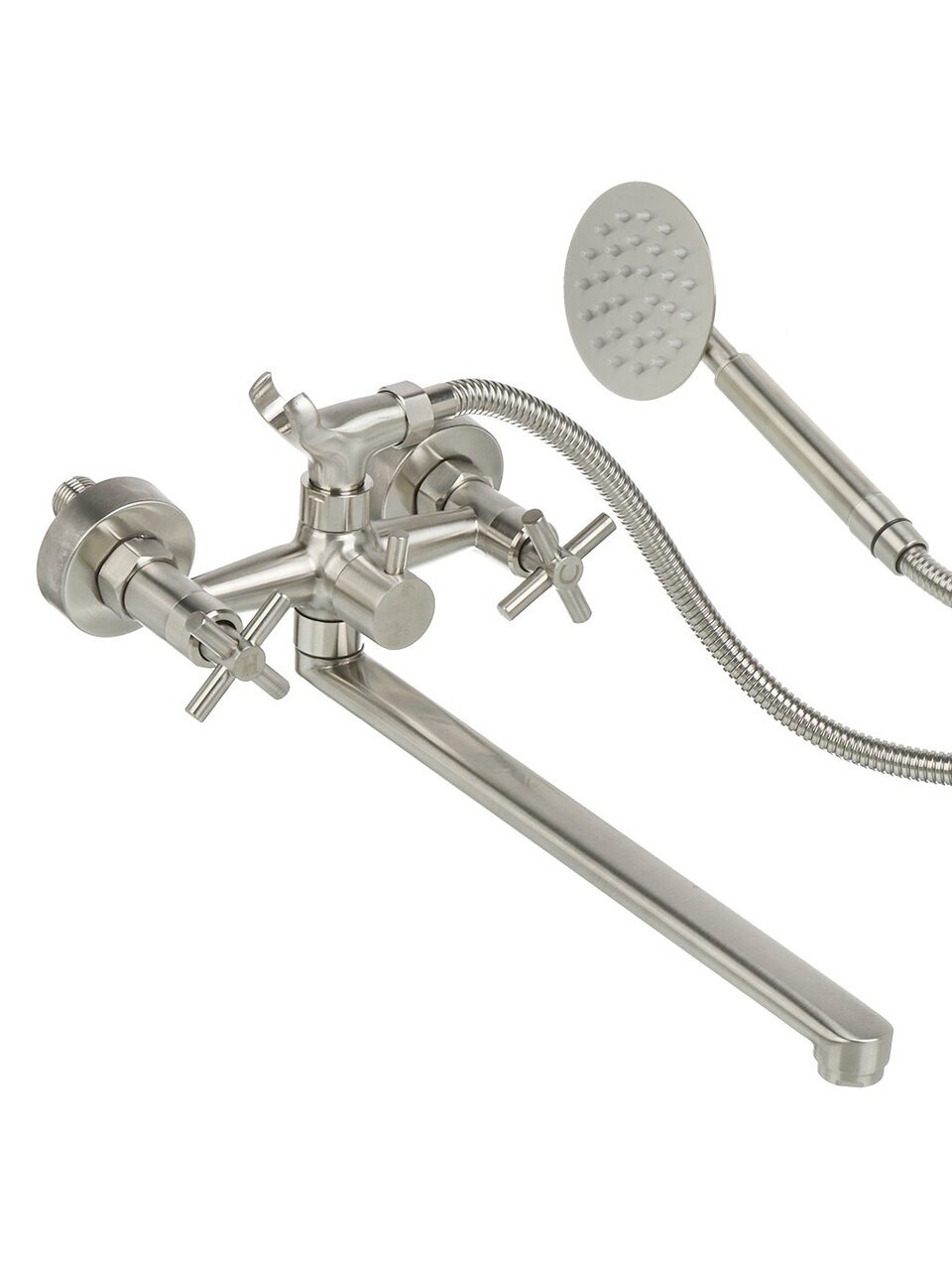 Для ванной с душем оптимально подойдет двухвентильный смеситель Aqwin A22357S: длинный поворотный излив 35 см, керамическая кран-букса, корпус из нержавеющей стали и матовое сатиновое покрытие обеспечивают долговечность и удобство использования.