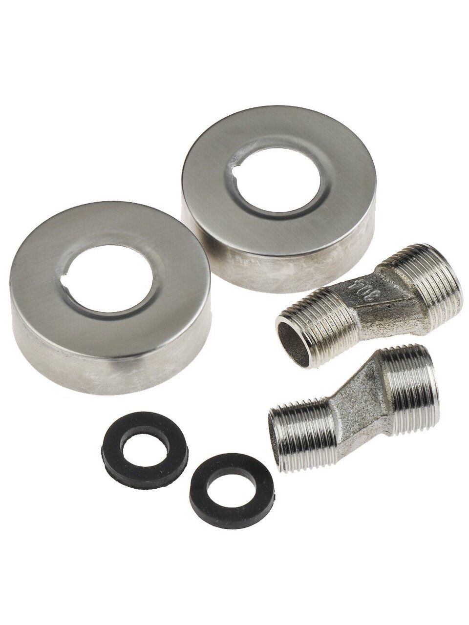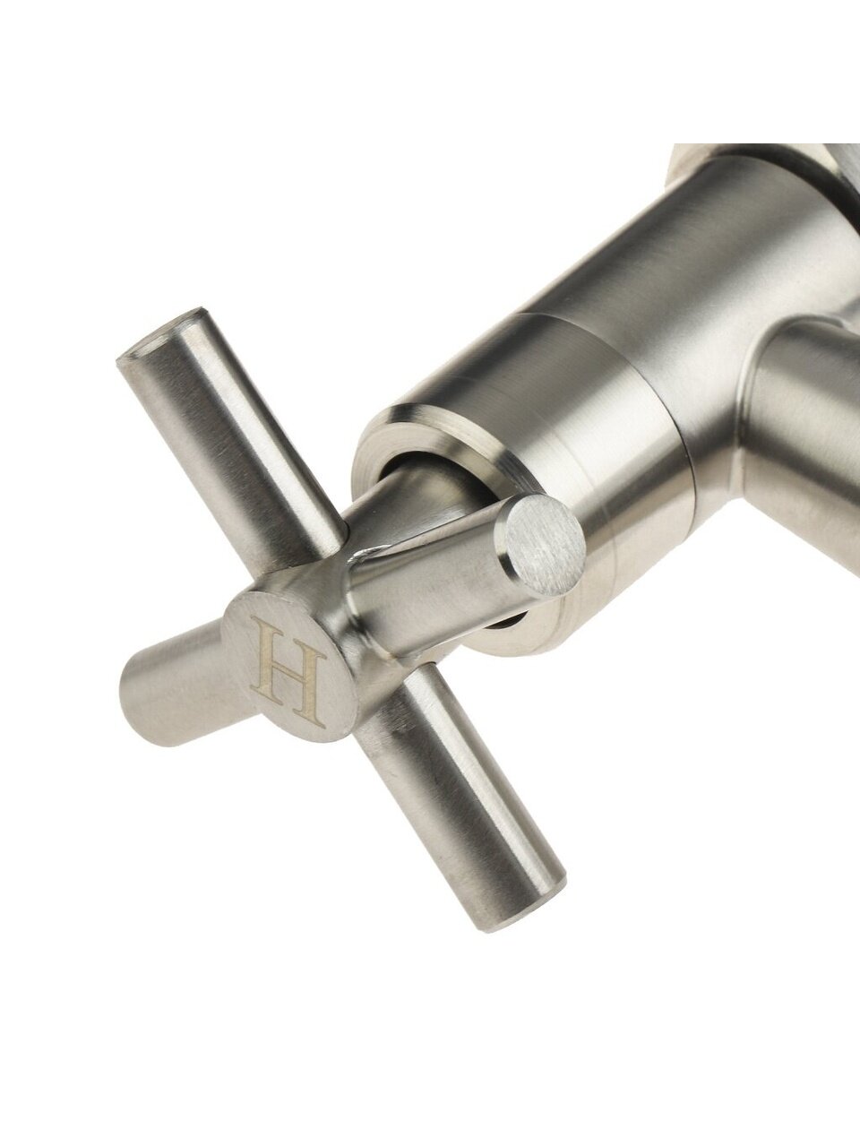 Длина излива — 35 см, тип управления — двухвентильный, материал — нержавеющая сталь, покрытие — сатин (серебристый цвет), монтаж — на 2 отверстия с помощью гайки, гарантия — 12 месяцев.