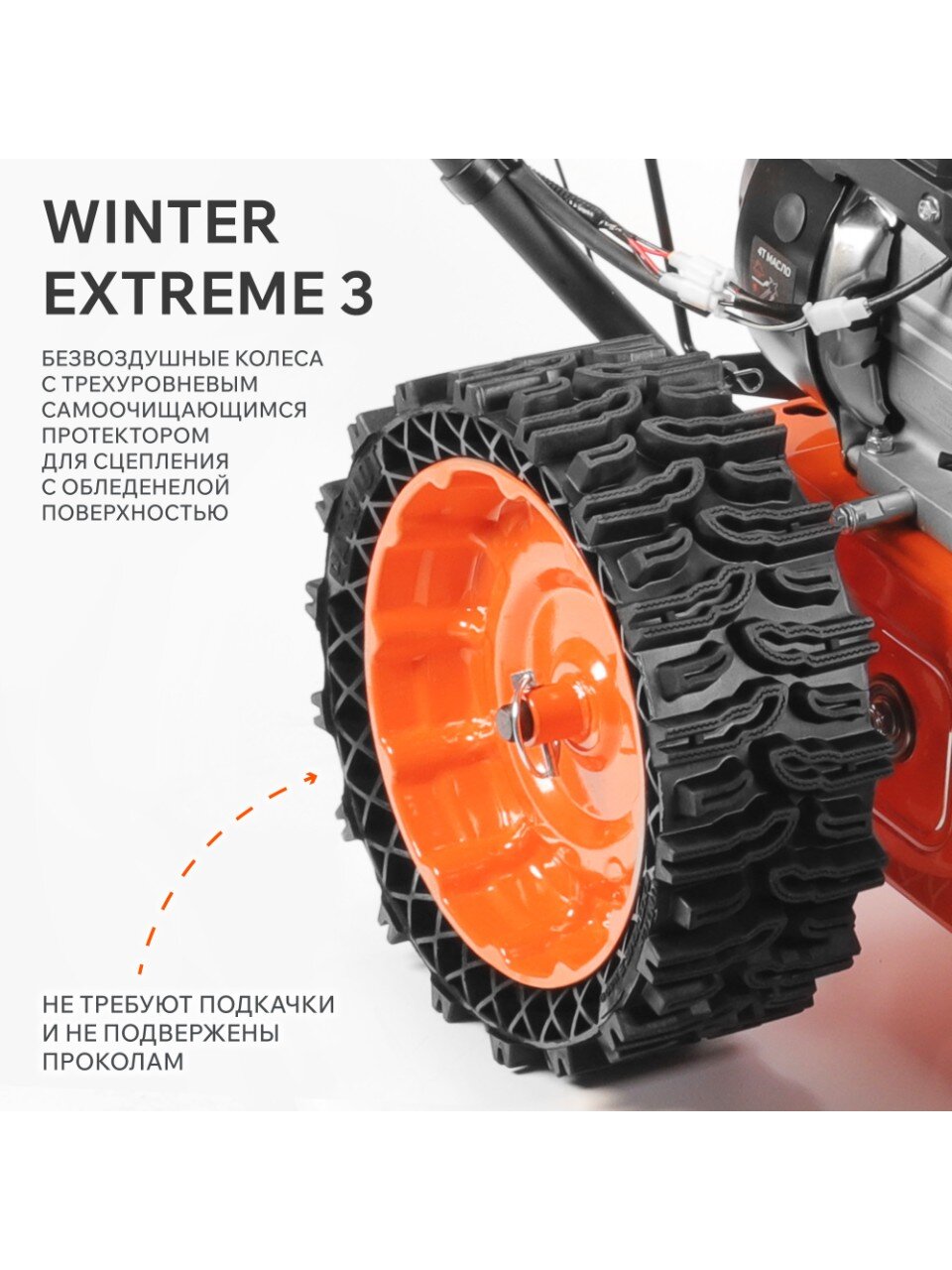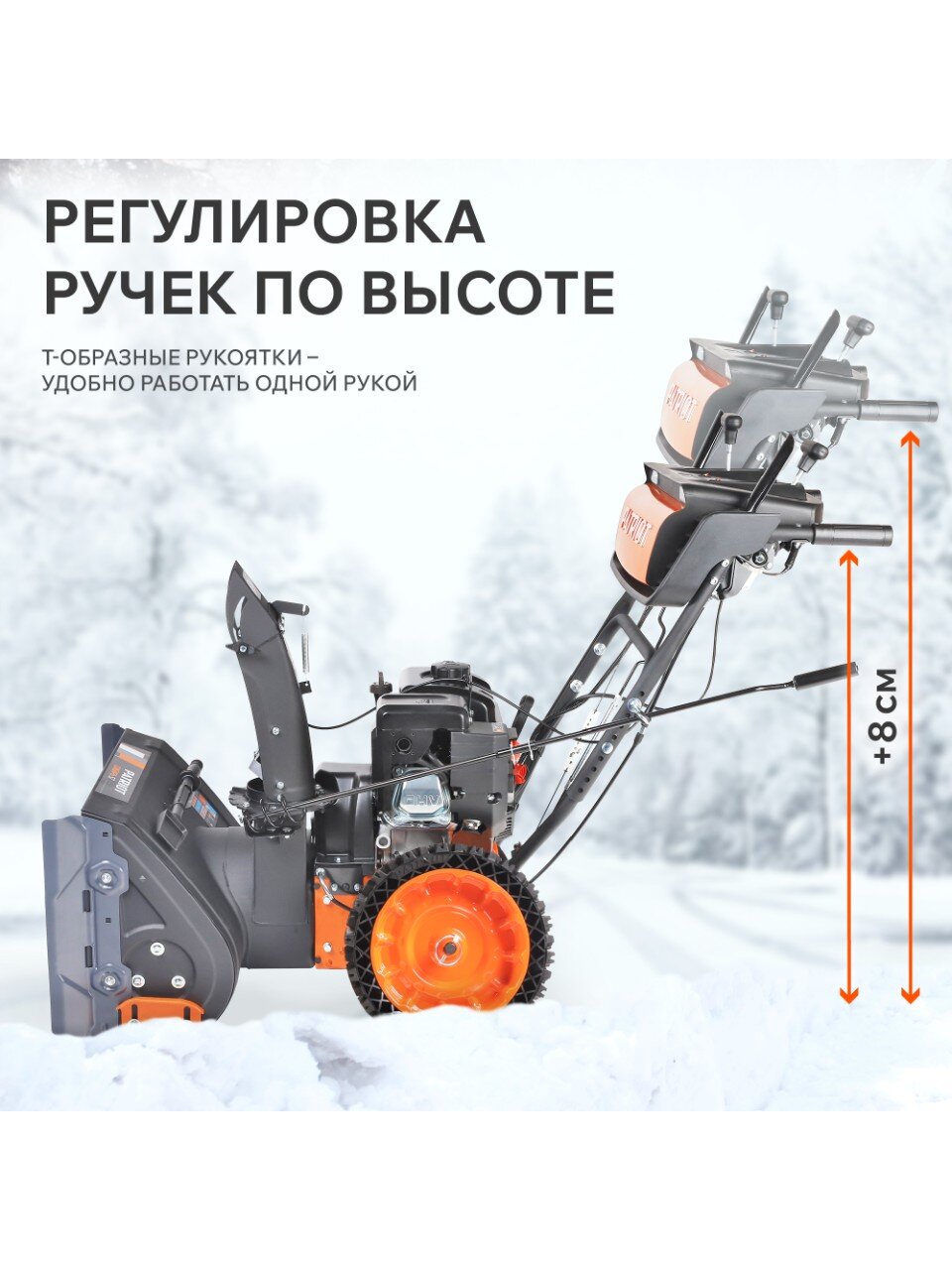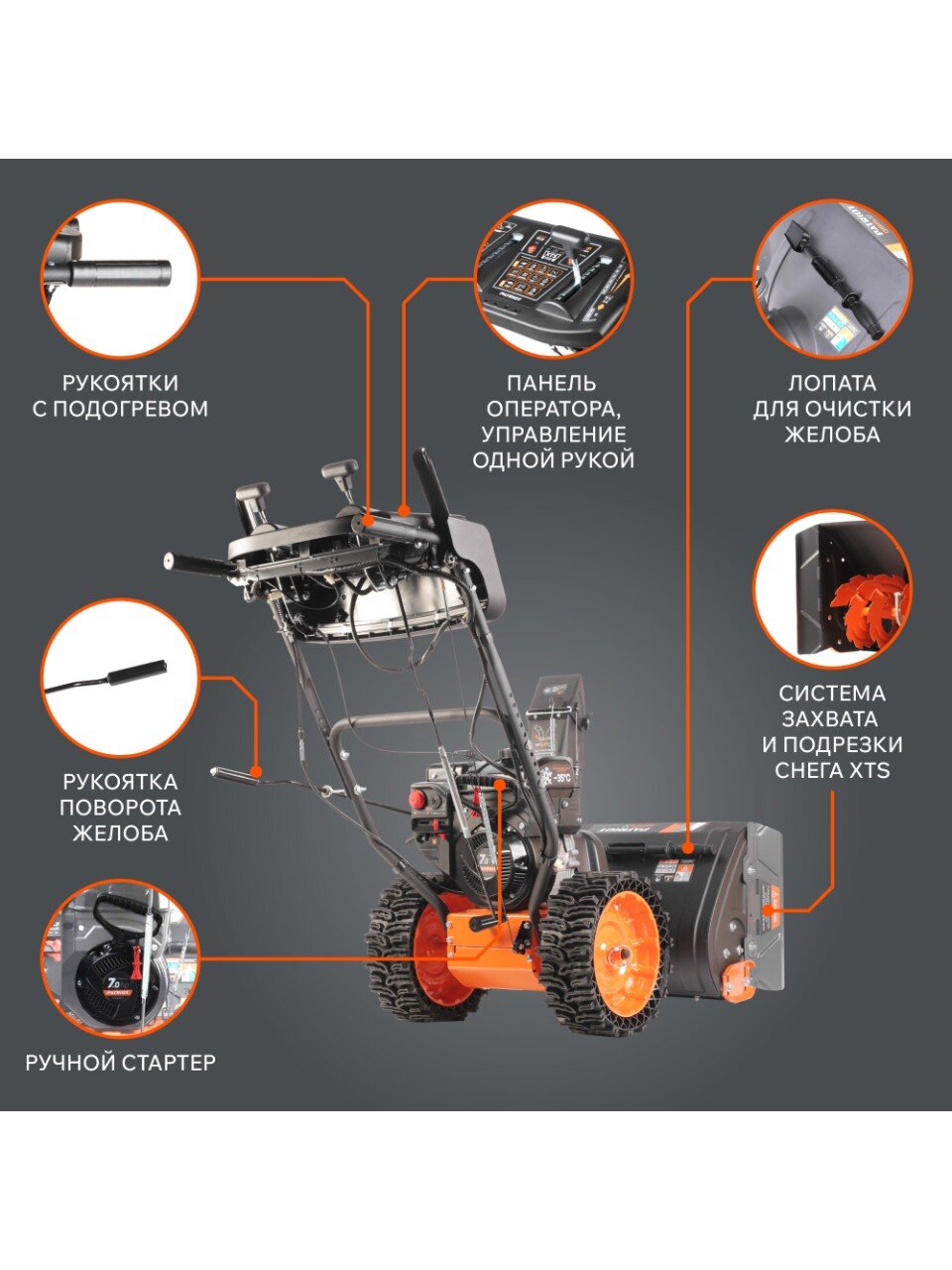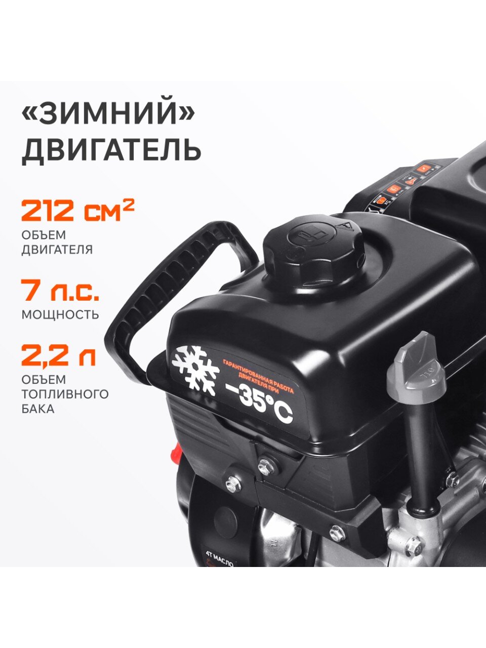 Бензиновый двигатель 7 л.с., LED-фары, подогрев рукояток и самоходность позволяют быстро и комфортно очищать территорию даже в сильные морозы и при плохой видимости.