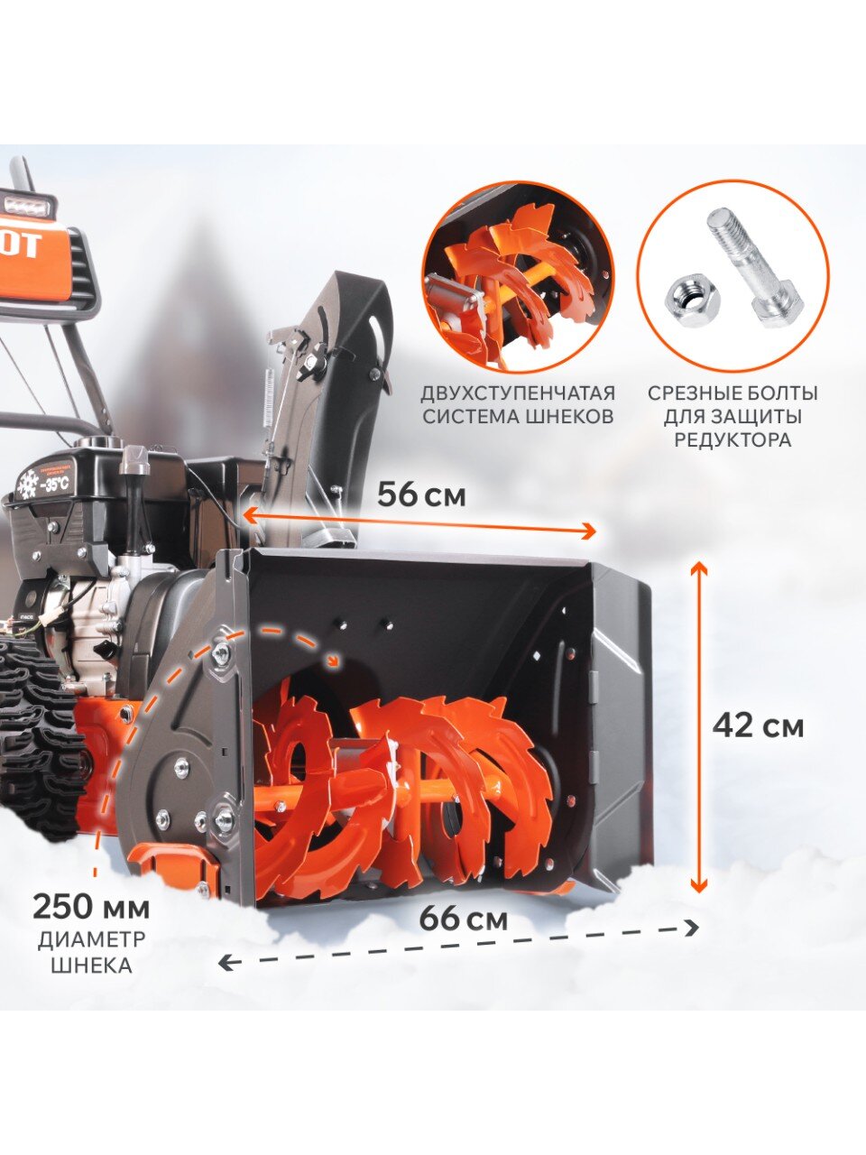 Patriot Сибирь 57 оснащён двухступенчатой системой очистки, шириной захвата 56 см и высотой 42 см — подходит для уборки плотного и глубокого снега на больших участках.