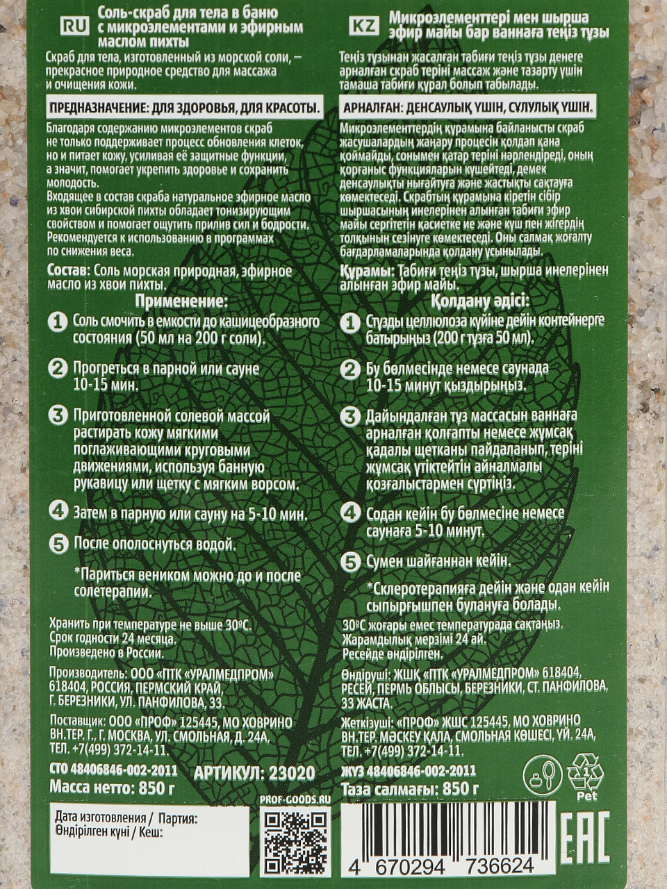 Скраб обеспечивает глубокое очищение, улучшает тонус кожи, придаёт ей гладкость и свежесть за счёт сочетания морской соли и эфирного масла пихты.