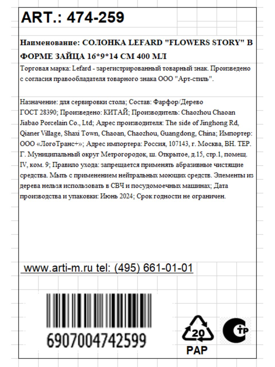 Вы можете приобрести «Солонка фарфор, 400 мл, 16х9х14 см, в форме зайца, Lefard, Flowers Story, 474-259» и другие товары в нашем интернет-магазине в Железногорске по низким ценам и с бесплатным самовывозом.