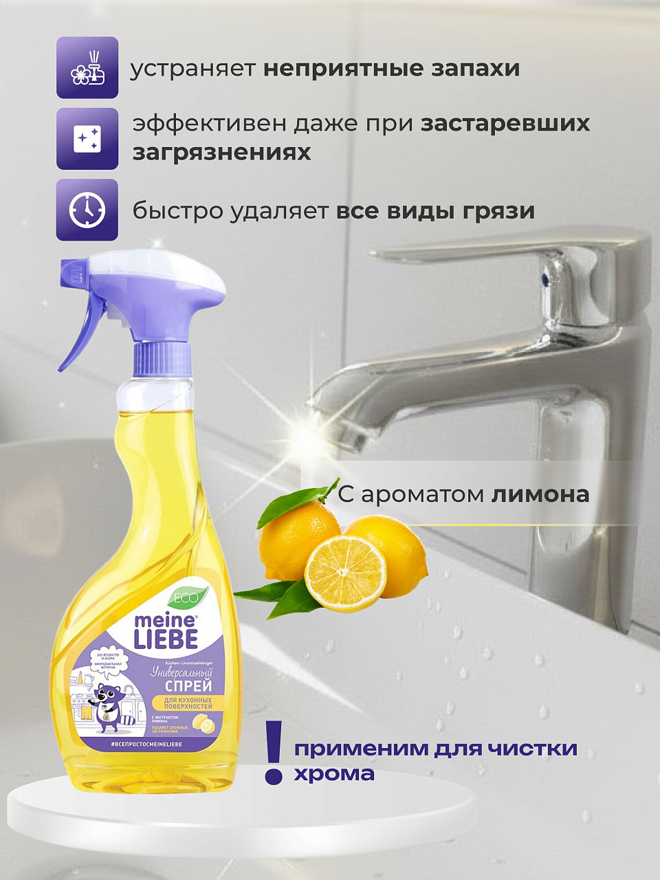 Концентрированное средство "Meine Liebe" предназначено для ежедневной уборки любых поверхностей на кухне: раковины, столешницы, кухонной плиты, холодильника, микроволновой печи. Для любых поверхностей, кроме деревянных и лакированных.