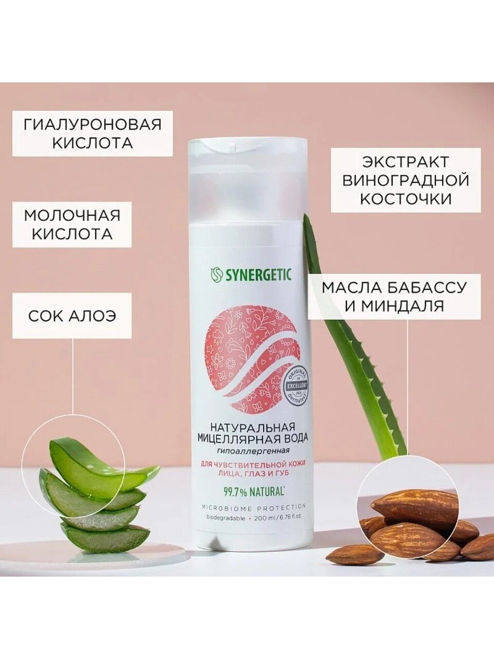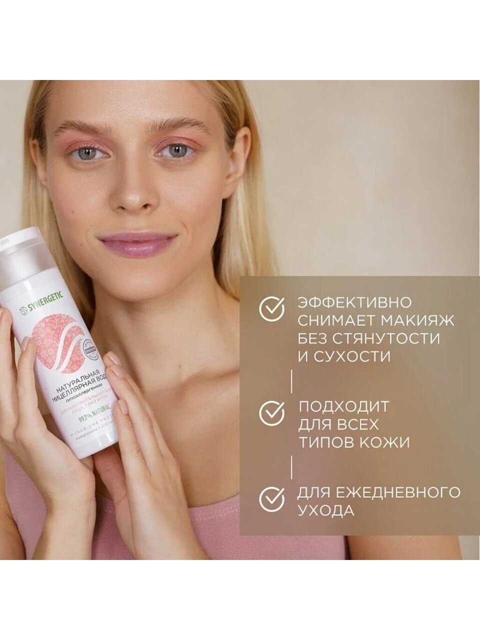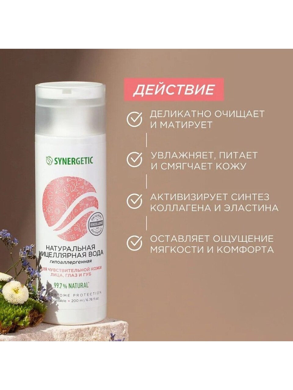 Гипоаллергенная мицеллярная вода Synergetic эффективно снимает макияж, матирует и очищает кожу лица от загрязнений. Активный увлажняющий комплекс поддерживает эластичность и упругость кожи.