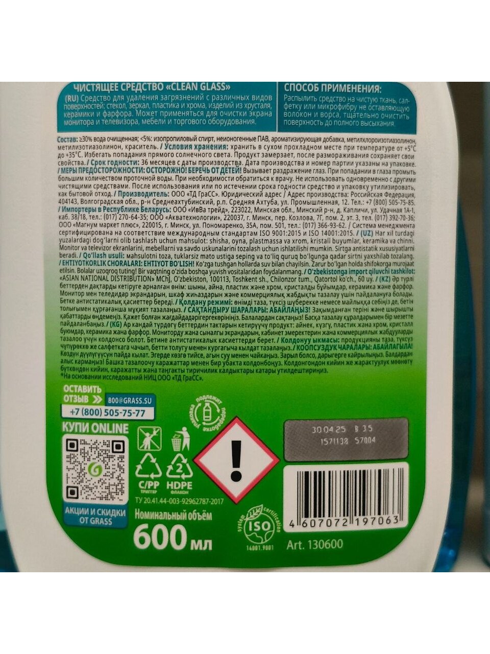 Спрей для стекол Grass Clean – это универсальное чистящее средство для окон, стекол и пластика. Не оставляет подтеков, разводов, экономичен в применении. Придает поверхностям антистатические свойства. Может применяться в офисе для чистки мебели, мониторов, стекол, зеркал, торгового оборудования. Готов к применению. Со средством Clean Glass мытье окон в вашем доме станет проще.