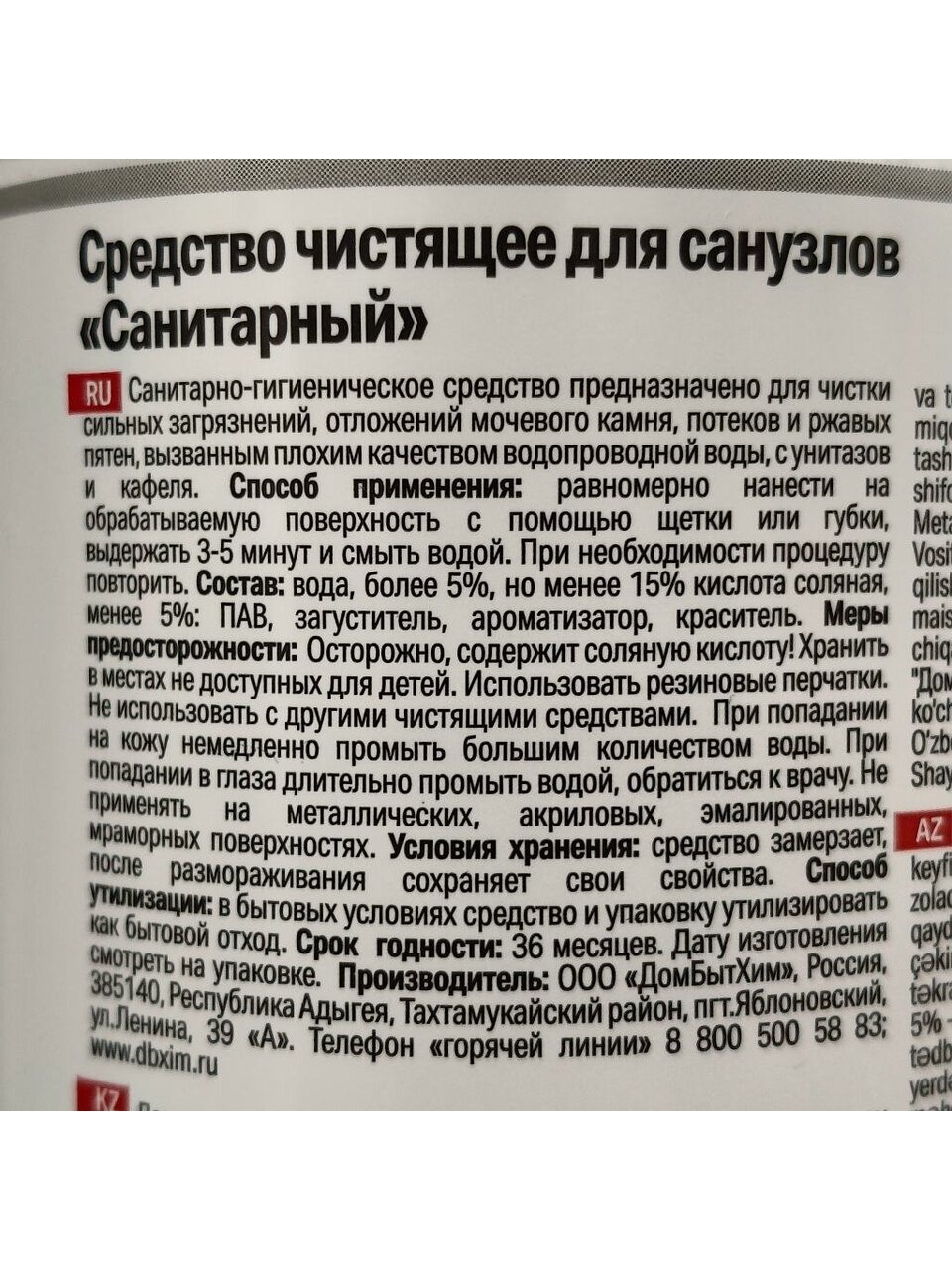 Средство предназначено для чистки, дезодорации и удаления устойчивых загрязнений: мочевого камня, отложения солей жесткости, ржавчины с унитазов, фаянсовых раковин и кафельных поверхностей, а также чистки металлических и полимерных поверхностей.