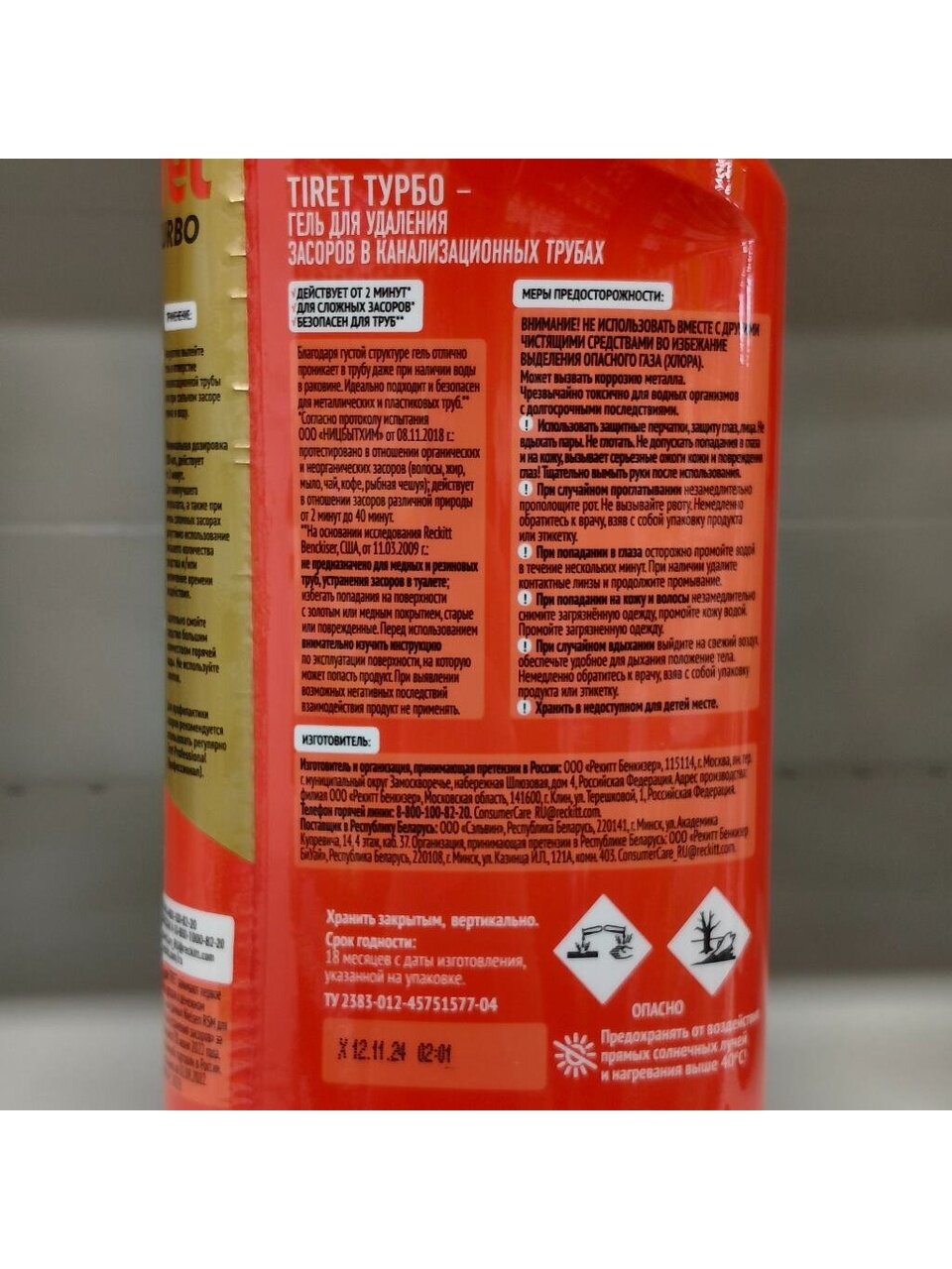 Средство для прочистки канализационных труб TIRET Turbo эффективно против микробов, устраняет засоры и неприятный запах. Предназначено для металлических и пластиковых труб.