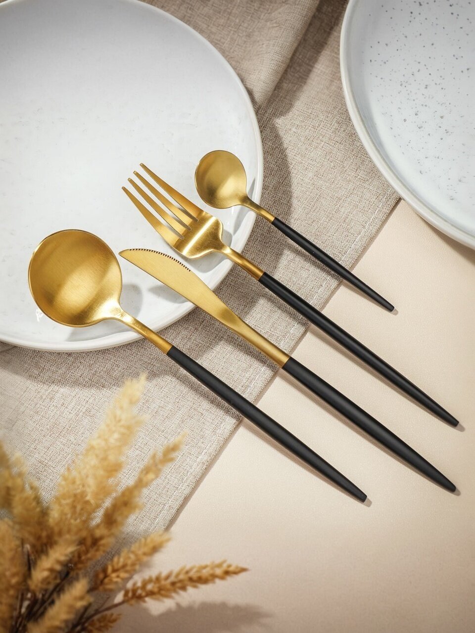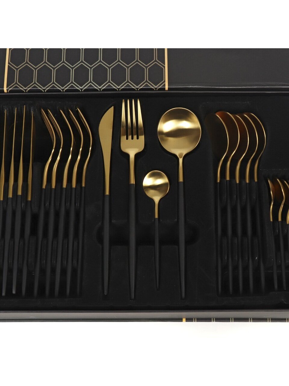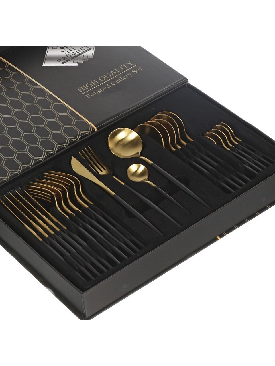 Премиальный набор столовых приборов из нержавеющей стали на 6 персон: элегантный черный с золотом, 24 предмета в подарочной упаковке — идеальный подарок и стиль для вашего стола.