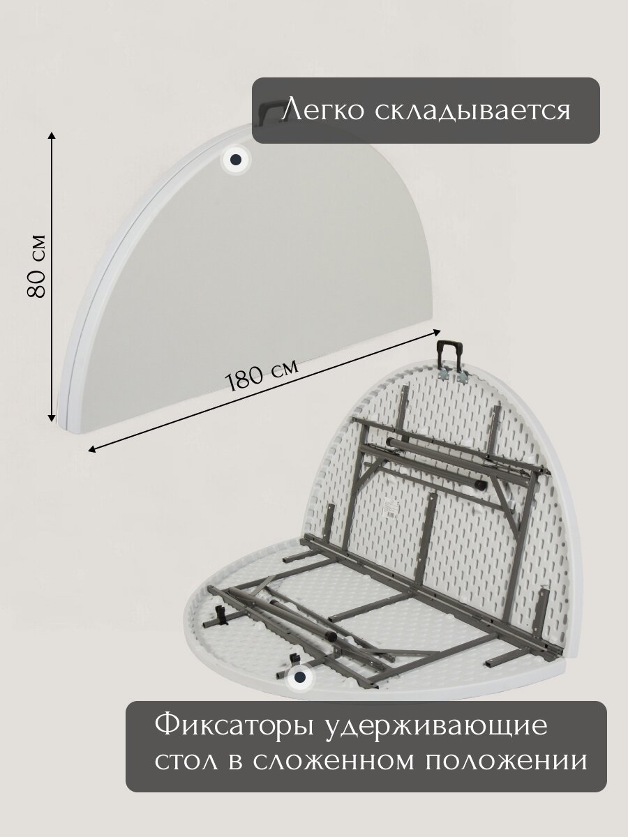 Стол круглый, диаметр 180 см, высота 74 см. Удобно размещает до 8 человек — отличный выбор для семейных и дружеских встреч.