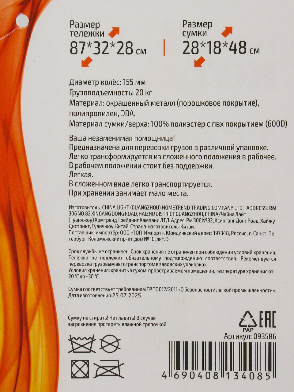 Габариты тележки — 87×35×28 см, размеры сумки - 28х18х48 см, диаметр колеса - 155 мм, материал — металл и 100% полиэстер, цвет — черный. Объем ~17 л. Модель отличается прочной рамой, влагостойкой тканью и эргономичной ручкой для удобства транспортировки.