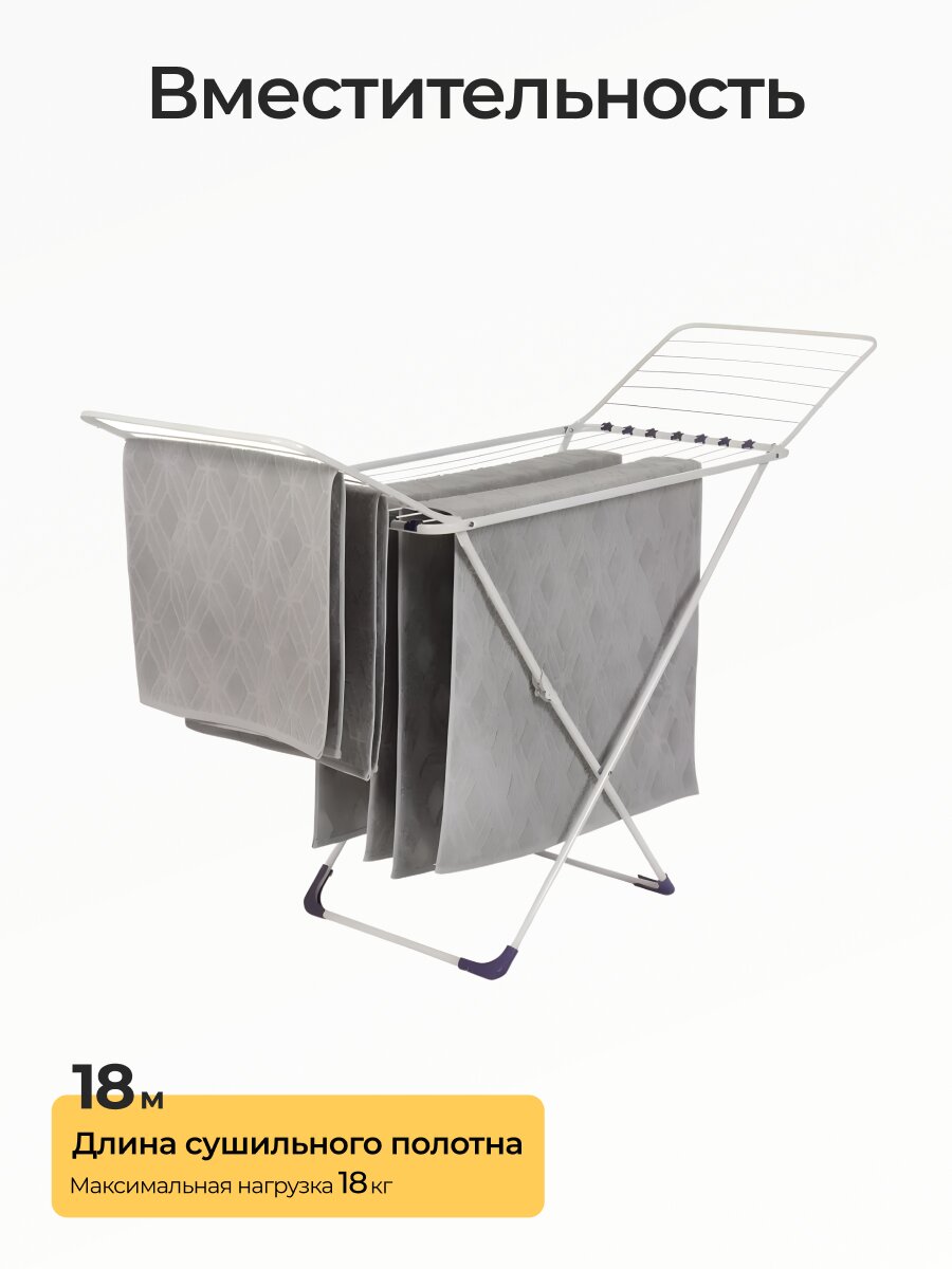Сушилка рассчитана на максимальную нагрузку до 18 кг благодаря металлическому основанию и 18 прочным прутьям. Это позволяет сушить одновременно большое количество белья, включая постельное и верхнюю одежду.