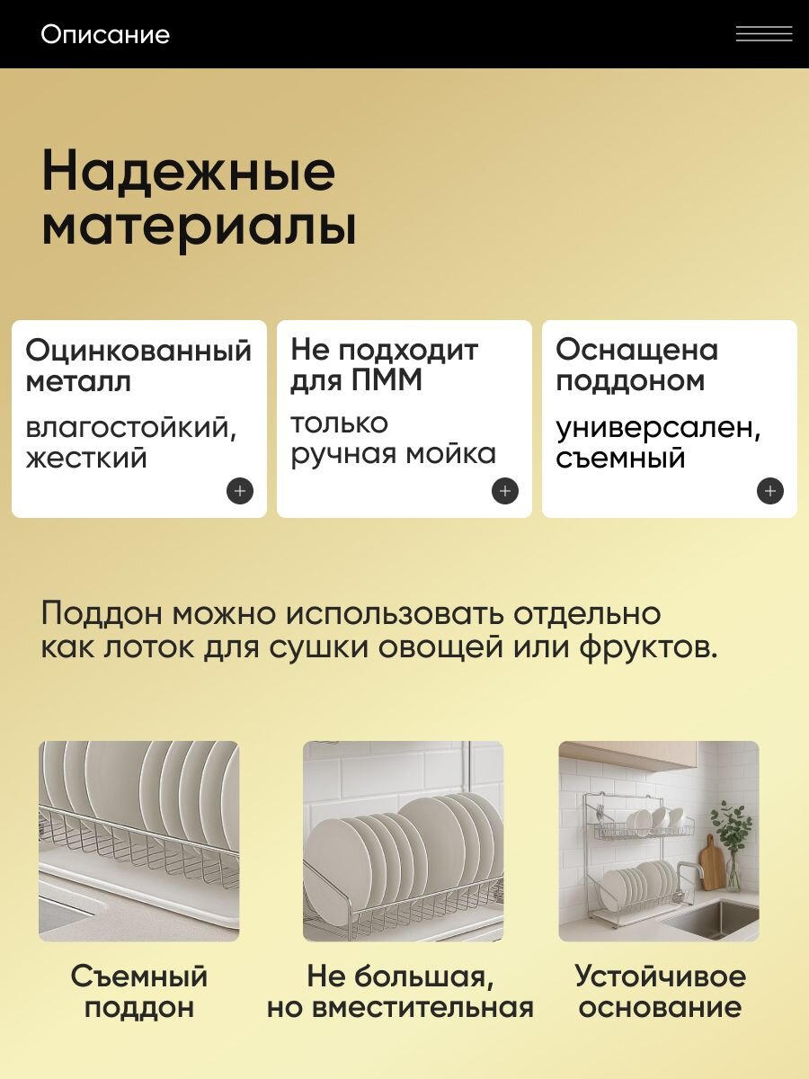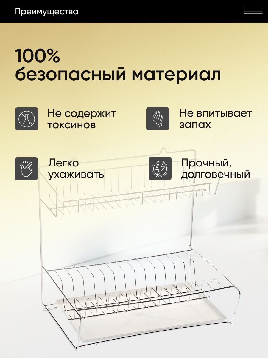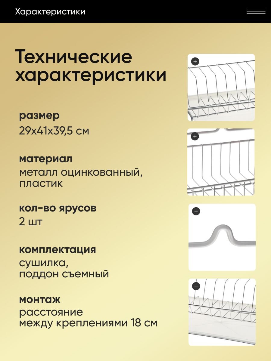 Чем отличается эта модель от аналогов? Она не раздвижная, что делает конструкцию более устойчивой и долговечной. Хромированная поверхность легко очищается, не теряет внешний вид со временем. Часто спрашивают, подходит ли сушилка для посуды для маленькой кухни: да, её размеры оптимальны для ограниченного пространства, а сборка не требует специальных инструментов. Как использовать сушилку? Просто разместите её рядом с мойкой или на стене, и вода будет стекать в поддон, сохраняя чистоту.