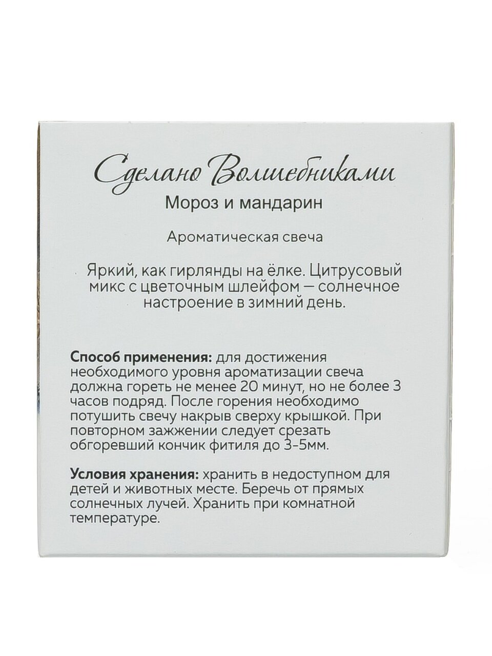 Свеча сочетает свежие морозные ноты и яркий цитрусовый аромат мандарина, идеально подходя для зимних и новогодних вечеров.