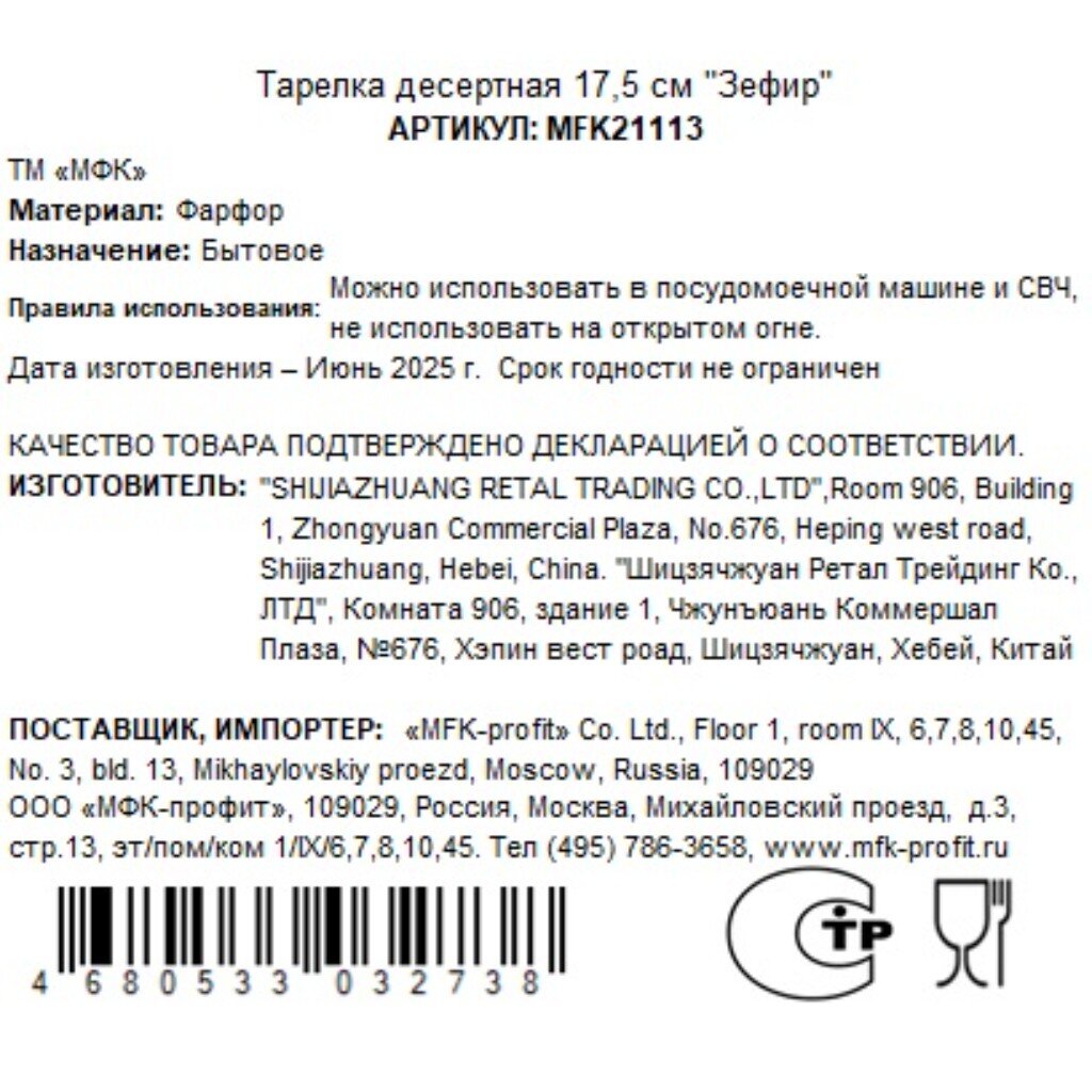 Вы можете приобрести «Тарелка десертная, фарфор, 17.5 см, круглая, Зефир, МФК, MFK21113» и другие товары в нашем интернет-магазине в Армавире по низким ценам и с бесплатным самовывозом.